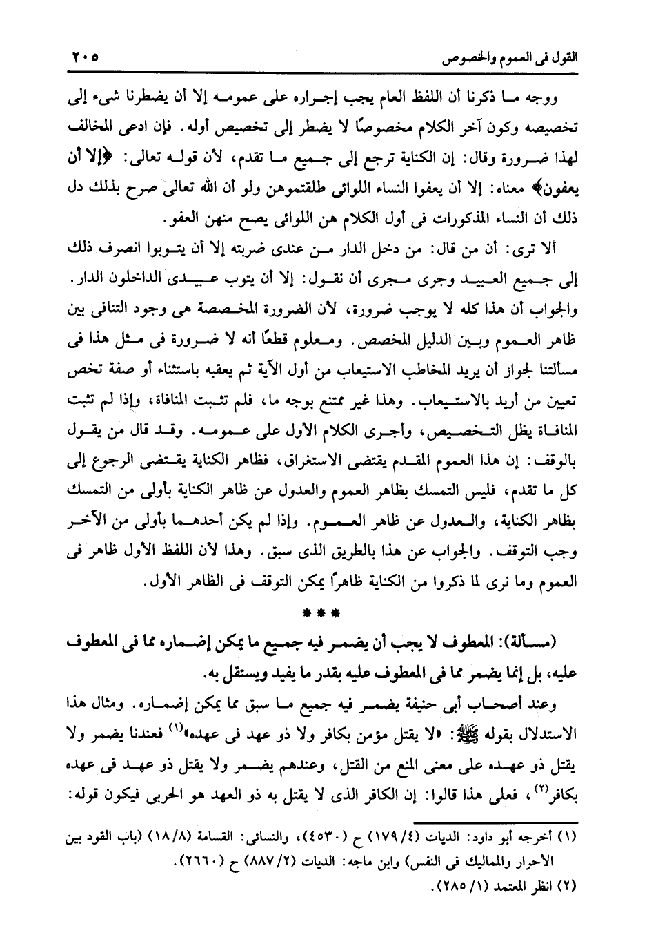ألا ترى أن من قال من دخل الدار من عندى ضربته إلا أن يتوبوا انصرف ذلك إلى جميع العبيد وجرى مجرى أن نقول إلا أن يتوب عبيدى الداخلون الدار والجواب أن هذا كله لا يوجب ضرورة لأن الضرورة المخصصة هى وجود التنافى بين ظاهر العموم وبين الدليل المخصص ومعلوم قطعا أنه لا ضرورة فى مثل هذا فى مسألتنا لجواز أن يريد المخاطب الاستيعاب من أول الآية ثم يعقبه باستثناء أو صفة تخص تعيين من أريد بالاستيعاب وهذا غير ممتنع بوجه ما فلم تثبت المنافاة وإذا لم تثبت المنافاة يظل التخصيص وأجرى الكلام الأول على عمومه وقد قال من يقول: بالوقف أن هذا العموم المقدم يقتضى الاستغراق فظاهر الكناية يقتضى الرجوع إلى كل ما تقدم فليس التمسك بظاهر العموم والعدول عن ظاهر الكناية بأولى من التمسك بظاهر الكناية والعدول عن ظاهر العموم وإذا لم يكن أحدهما بأولى من الآخر وجب التوقف والجواب عن هذا بالطريق الذى سبق وهذا لأن اللفظ الأول ظاهر فى العموم وما نرى لما ذكروا من الكناية ظاهرا يمكن التوقف فى الظاهر الأول.