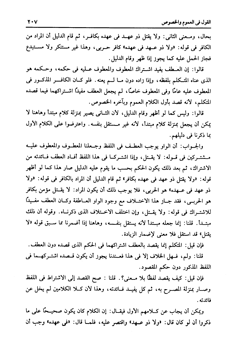 قالوا: أن العطف يفيد اشتراك المعطوف والمعطوف عليه فى حكمه وحكمه هو الذى عناه المتكلم بلفظه وإذا زاده دون ما لم يعنه فلو كان الكافر المذكور فى المعطوف عليه عاما وفى المعطوف خاصا لم يجعل العطف مفيدا اشتراكهما فيما قصده المتكلم لأنه قصد بأول الكلام العموم وبآخره الخصوص.