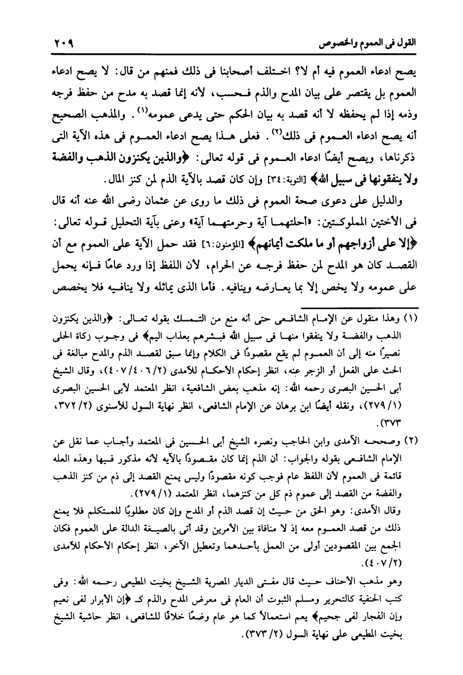 2 وصححه الآمدي وابن الحاجب ونصره الشيخ أبي الحسين في المعتمد وأجاب عما نقل عن الإمام الشافعي بقوله والجواب: أن الذم إنما كان مقصودا بالآية لأنه مذكور فيها وهذه العلة قائمة في العموم لأن اللفظ عام فوجب كونه مقصودا وليس يمنع القصد إلى ذم من كنز الذهب والفضة من القصد إلى عموم ذم كل من كنزهما انظر المعتمد 1/179.