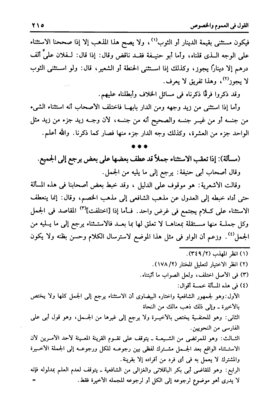 وقالت الأشعرية هو موقوف على الدليل وقد خبط بعض أصحابنا فى هذه المسألة حتى أداه خبطه إلى العدول عن مذهب الشافعى إلى مذهب الخصم وقال إنما ينعطف الاستثناء على كلام يجتمع فى غرض واحد فأما إذا [اختلفت] 3 المقاصد فى الجمل وكل جملة منها مستقلة بمعناها لا تعلق لها بما بعد فالاستثناء يرجع إلى ما يليه من الجمل4 وزعم أن الواو فى مثل هذا الموضع لاسترسال الكلام وحسن بظنه ولا يكون.