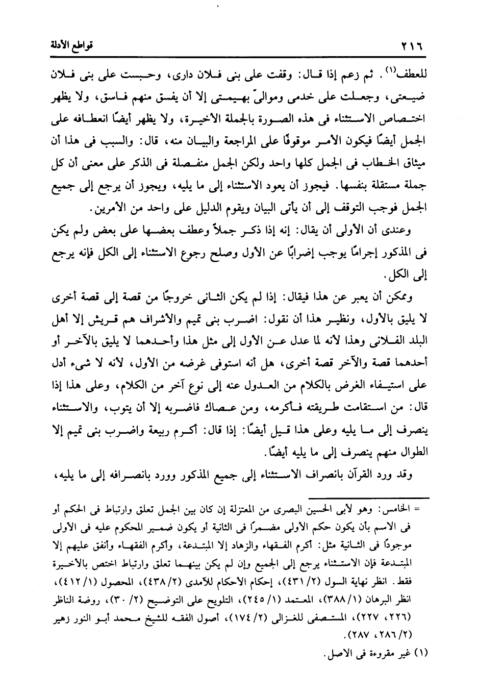 = الخامس وهو لأبي الحسين البصري من المعتزلة إن كان بين الجمل تعلق وارتباط في الحكم أو في الاسم بأن يكون حكم الأولى مضمرافي الثانية أو يكون ضمير المحكوم عليه في الأولى موجودا في الثانية مثل: أكرم الفقهاء والزهاد إلا المبتدعة وأكرم الفقهاء وأنفق عليهم إلا المبتدعة فإن الاستثناء يرجع إلى الجميع وإن لم يكن بينهما تعلق وارتباط اختص بالأخيرة فقط انظر نهاية السول 2/431 إحكام الأحكام للآمدي 2/438 المحصول 1/412 انظر البرهان 1/388 المعتمد 1/245 التلويح على التوضيح 2/30 روضة الناظر 226, 227 المستصفى للغزالي 2/174 أصول الفقه للشيخ أبو النور زهير 2/286, 287.