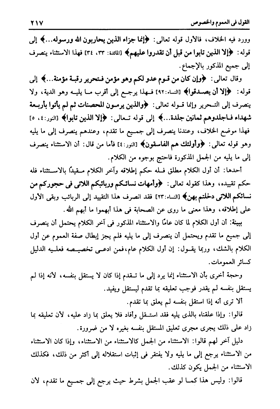 وقال تعالى فإن كان من قوم عدو لكم وهو مؤمن فتحرير رقبة مؤمنة إلى قوله: {إِلَّا أَنْ يَصَّدَّقُوا} [النساء: 92] فهذا يرجع إلى أقرب ما يليه وهو الدية ولا ينصرف إلى التحرير وإنما قوله تعالى: {وَالَّذِينَ يَرْمُونَ الْمُحْصَنَاتِ ثُمَّ لَمْ يَأْتُوا بِأَرْبَعَةِ شُهَدَاءَ فَاجْلِدُوهُمْ ثَمَانِينَ جَلْدَةً} إلى قوله تعالى: {إِلَّا الَّذِينَ تَابُوا} [النور: 4 , 5] فهذا موضع الخلاف وعندنا ينصرف إلى جميع ما تقدم وعندهم ينصرف إلى ما يليه وهو قوله تعالى: {وَأُولَئِكَ هُمُ الْفَاسِقُونَ} [النور: 4] فأما من قال أن الاستثناء ينصرف إلى ما يليه من الجمل المذكورة فاحتج بوجوه من الكلام.