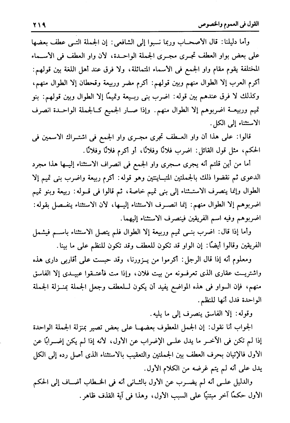 أما من أين قلتم أنه يجرى مجرى واو الجمع فى انصراف الاستثناء إليها هذا مجرد الدعوى ثم نقضوا ذلك بالجملتين المتباينتين وهو قوله أكرم ربيعة واضرب بنى تميم إلا الطوال وإنما ينصرف الاستثناء إلى بنى تميم خاصة ثم قالوا: فى قوله ربيعة وبنو تميم اضربوهم إلا الطوال منهم إنما انصرف الاستثناء إليها لأن الاستثناء ينفصل بقوله اضربوهم وفيه اسم الفريقين فينصرف الاستثناء إليهما.