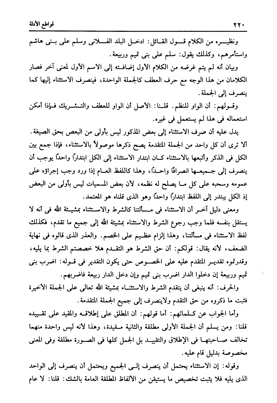 ومعنى دليل آخر أن الاستثناء فى مسألتنا كالشرط والاستثناء بمشيئة الله فى أنه لا يستقل بنفسه فلما وجب رجوع الشرط والاستثناء بمشيئة الله إلى جميع ما تقدم فكذلك لفظ الاستثناء فى مسألتنا وهذا إلزام عظيم على الخصم والعذر الذى قالوه فى نهاية الضعف لأنه يقال قولكم أن حق الشرط هو التقدم هلا خصصتم الشرط بما يليه وقدرتموه تقدير المتقدم عليه على الخصوص حتى يكون التقدير فى قوله اضرب بنى تميم وربيعة أن دخلوا الدار اضرب بنى تميم وأن دخل الدار ربيعة فاضربهم.