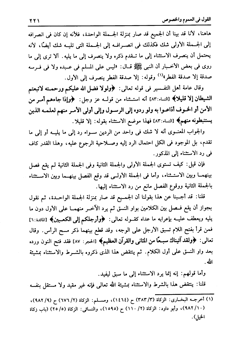 هاهنا لأنا قد بينا أن الجميع قد صار بمنزلة الجملة الواحدة فلأنه أن كان فى انصرافه إلى الجملة الأولى شك فكذلك فى انصرافه إلى الجملة التى تليه شك أيضا لأنه يحتمل أن ينصرف الاستثناء إلى ما تقدم ذكره ولا ينصرف إلى ما يليه ألا ترى إلى ما روى فى بعض الأخبار أن النبي صلى الله عليه وسلم قال: "ليس على المسلم فى عبده ولا فى فرسه صدقة إلا صدقة الفطر" 1 وقوله إلا صدقة الفطر ينصرف إلى الأول.