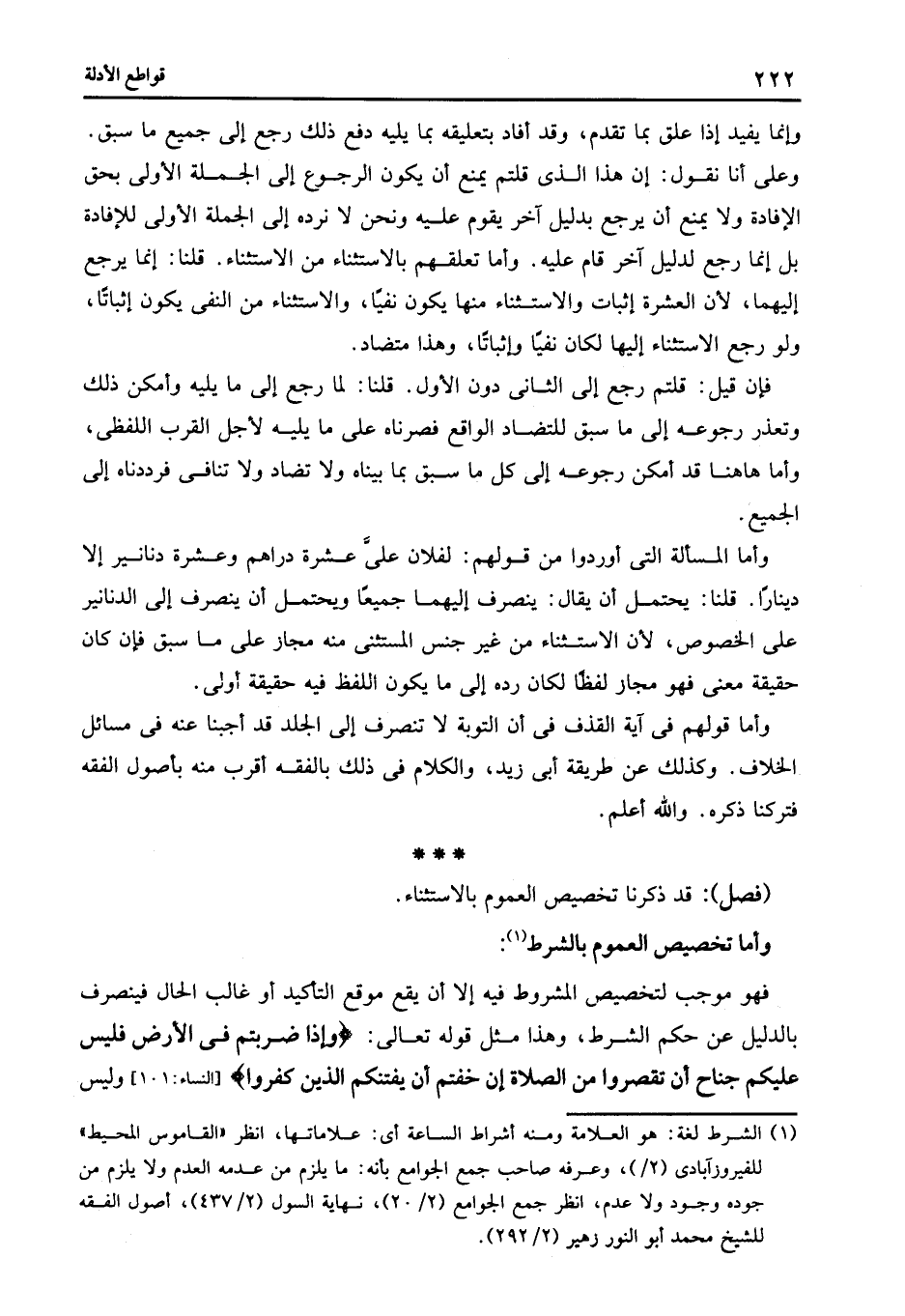 وعلى أنا نقول أن هذا الذى قلتم يمنع أن يكون الرجوع إلى الجملة الأولى بحق الإفادة ولا يمنع أن يرجع بدليل آخر يقوم عليه ونحن لا نرده إلى الجملة الأولى للإفادة بل إنما رجع لدليل آخر قام عليه وأما تعلقهم بالاستثناء من الاستثناء قلنا إنما يرجع إليهما لأن العشرة إثبات والاستثناء منها يكون نفيا والاستثناء من النفى يكون إثباتا ولو رجع الاستثناء إليها لكان نفيا وإثباتا وهذا متضاد.