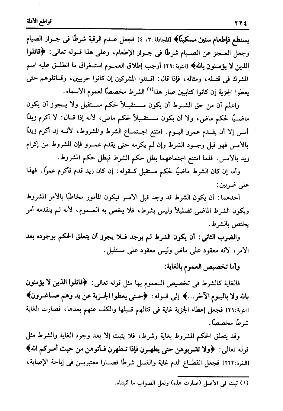 يَسْتَطِعْ فَإِطْعَامُ سِتِّينَ مِسْكِيناً} [المجادلة: 4] فجعل عدم الرقبة شرطا فى جواز الصيام وجعل العجز عن الصيام شرطا فى جواز الإطعام وعلى هذا قوله تعالى: {قَاتِلُوا الَّذِينَ لا يُؤْمِنُونَ بِاللَّهِ} [التوبة: 29] أوجب إطلاق العموم استغراق ما انطلق عليه اسم المشرك فى قتله ومثاله فإذا قال اقتلوا المشركين أن كانوا حربيين وقاتلوهم حتى يعطوا الجزية أن كانوا كتابيين صار هذا1 الشرط مخصصا لعموم الأسماء.