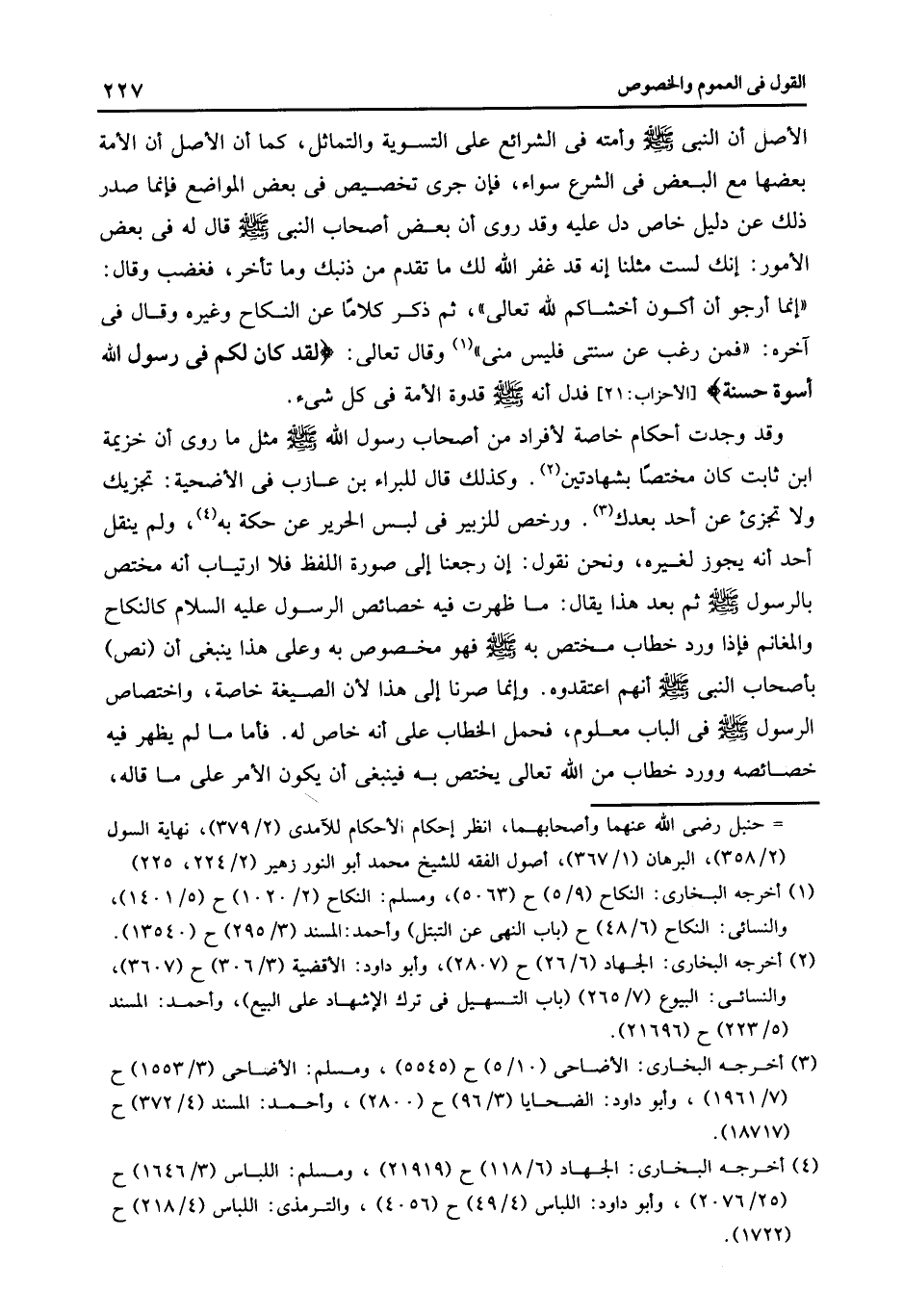 وقد وجدت أحكام خاصة لأفراد من أصحاب رسول الله صلى الله عليه وسلم مثل ما روى أن خزيمة ابن ثابت كان مختصا بشهادتين2 وكذلك قال للبراء بن عازب فى الأضحية تجزيك ولا تجزيء عن أحد بعدك3 ورخص للزبير فى لبس الحرير عن حكة به4 ولم ينقل أحد أنه يجوز لغيره ونحن نقول أن رجعنا إلى صورة اللفظ فلا ارتياب أنه مختص بالرسول صلى الله عليه وسلم ثم بعد هذا يقال ما ظهرت فيه خصائص الرسول عليه السلام كالنكاح والمغانم فإذا ورد خطاب مختص به صلى الله عليه وسلم فهو مخصوص به وعلى هذا ينبغى أن نص بأصحاب النبي صلى الله عليه وسلم أنهم اعتقدوه وإنما صرنا إلى هذا لأن الصيغة خاصة واختصاص الرسول صلى الله عليه وسلم فى الباب معلوم فحمل الخطاب على أنه خاص له فأما ما لم يظهر فيه خصائصه وورد خطاب من الله تعالى يختص به فينبغى أن يكون الأمر على ما قاله.