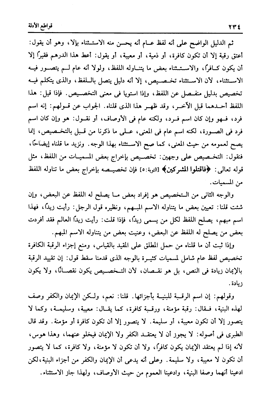 وقولهم أن اسم الرقبة للبنية بأجزائها قلنا نعم ولكن الإيمان والكفر وصف لهذه البنية فقال رقبة مؤمنة ورقبة كافرة كما يقال معيبة وسليمة وكما لا يتصور إلا أن تكون معيبة أو سليمة لا يتصور إلا أن تكون كافرة أو مؤمنة وقد قال الطبرى فى أصوله لا يجوز أن لا يعتقد الكفر ولا الإيمان فيخلو عنهما وهذا هوس لأنه إذا لم يعتقد الإيمان يكون كافرا ولا أن تكون لا مؤمنة ولا كافرة كما لا يتصور أن تكون لا معيبة ولا سليمة وعلى أنه يدعى أن الإيمان والكفر من أجزاء البنية لكن ادعينا أنهما وصفا البنية وادعينا العموم من حيث الأوصاف ولهذا جاز الاستثناء.