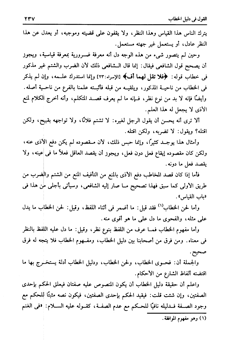 فأما إذا كان قصد المخاطب دفع الأذى بالمنع من التأفيف المنع من الشتم والضرب من طريق الأولى كما سبق فهذا تصحيح ما صار إليه الشافعى وسيأتى بأجلى من هذا فى باب القياس.