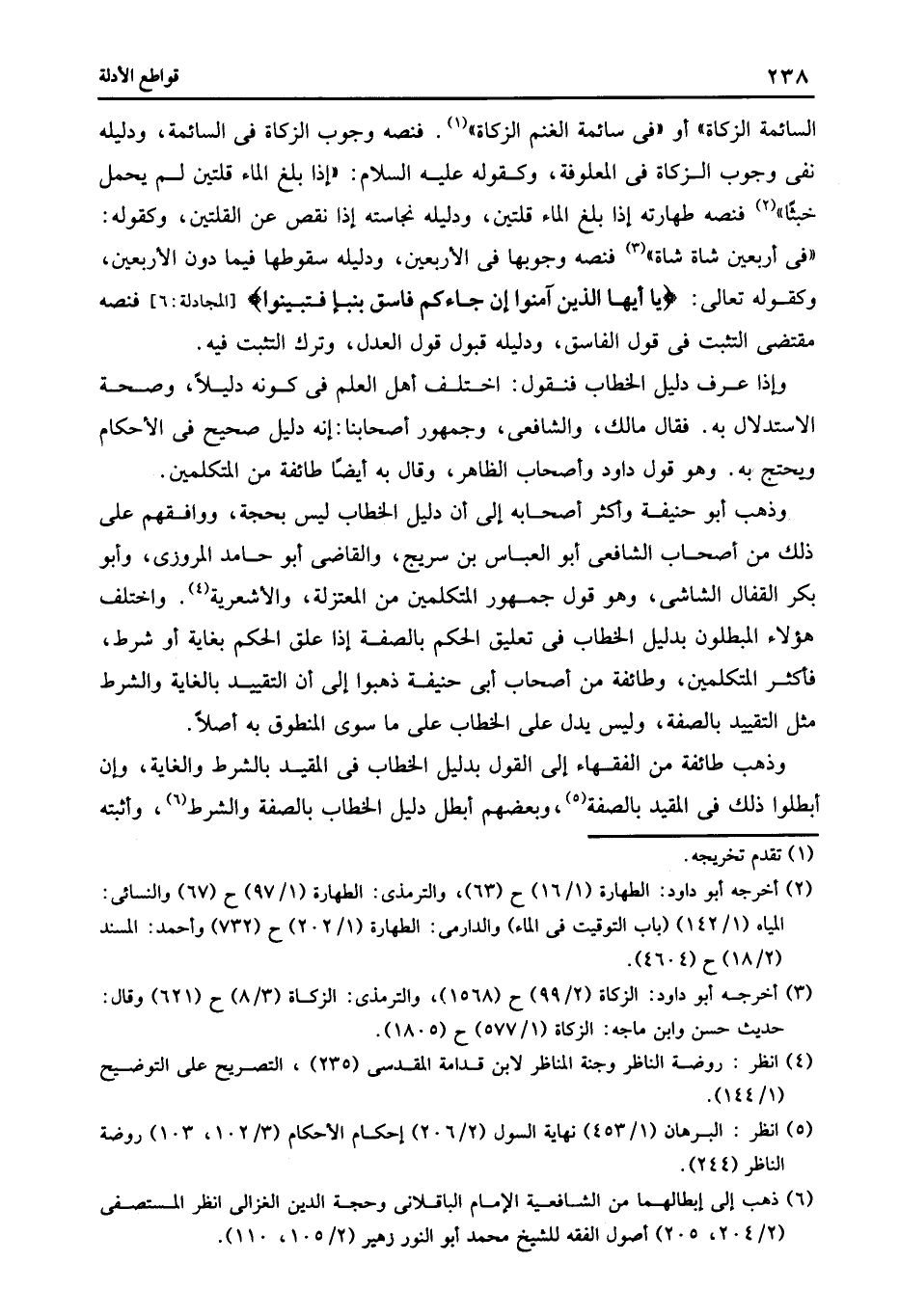 السائمة الزكاة أو فى سائمة الغنم الزكاة" 1 فنصه وجوب الزكاة فى السائمة ودليله نفى وجوب الزكاة فى المعلوفة وكقوله عليه السلام: "إذا بلغ الماء قلتين لم يحمل خبثا" 2 فنصه طهارته إذا بلغ الماء قلتين ودليله نجاسته إذا نقص عن القلتين وكقوله: "فى أربعين شاة شاة" 3 فنصه وجوبها فى الأربعين ودليله سقوطها فيما دون الأربعين وكقوله تعالى: {يَا أَيُّهَا الَّذِينَ آمَنُوا إِنْ جَاءَكُمْ فَاسِقٌ بِنَبَأٍ فَتَبَيَّنُوا} [الحجرات: 6] فنصه مقتضى التثبت فى قول الفاسق ودليله قبول قول العدل وترك التثبت فيه.