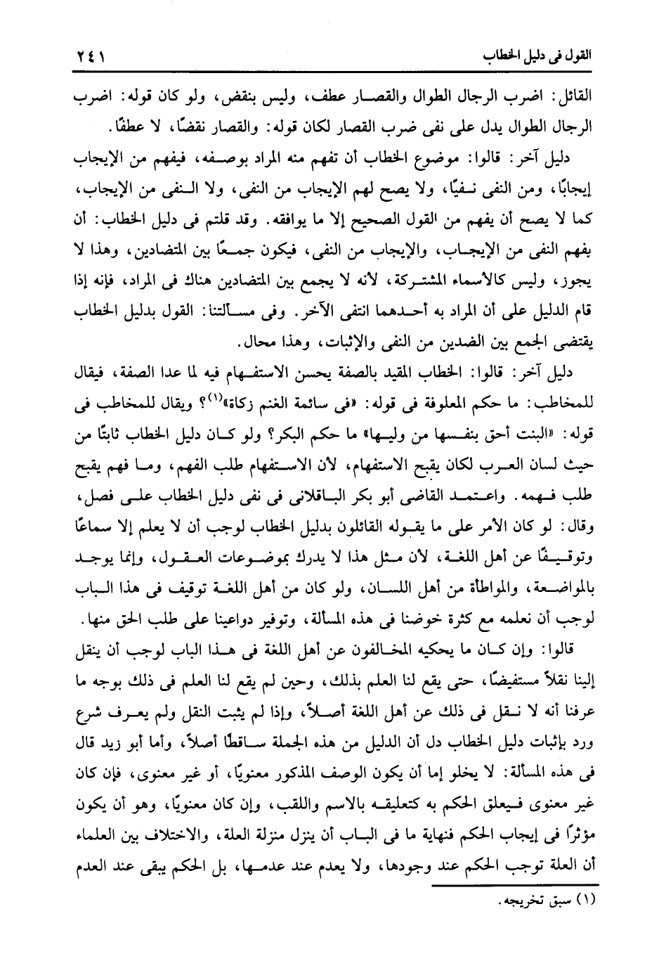 دليل آخر قالوا: الخطاب المقيد بالصفة يحسن الاستفهام فيه لما عدا الصفة فيقال للمخاطب ما حكم المعلوفة فى قوله: "فى سائمة الغنم زكاة" 1 ويقال للمخاطب فى قوله البنت أحق بنفسها من وليها ما حكم البكر ولو كان دليل الخطاب ثابتا من حيث لسان العرب لكان يقبح الاستفهام لأن الاستفهام طلب الفهم وما فهم يقبح طلب فهمه واعتمد القاضى أبو بكر الباقلانى فى نفى دليل الخطاب على فصل وقال لو كان الأمر على ما يقوله القائلون بدليل الخطاب لوجب أن لا يعلم إلا سماعا وتوقيفا عن أهل اللغة لأن مثل هذا لا يدرك بموضوعات العقول وإنما يوجد بالمواضعة والمواطأة من أهل اللسان ولو كان من أهل اللغة توقيف فى هذا الباب لوجب أن نعلمه مع كثرة خوضنا فى هذه المسألة وتوفير دواعينا على طلب الحق منها.