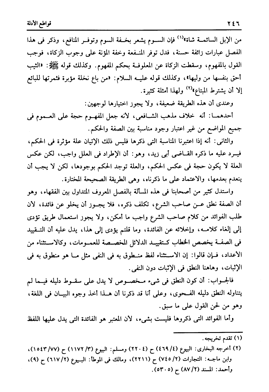 من الإبل السائمة شاة" 1 فإن السوم يشعر بخفة السوم وتوفر المنافع وذكر فى هذا الفصل عبارات زائفة حسنة فدل توفر المنفعة وخفة المؤنة على وجوب الزكاة فوجب القول بالمفهوم وسقطت الزكاة عن المعلوفة بحكم المفهوم وكذلك قوله صلى الله عليه وسلم: "الثيب أحق بنفسها من وليها" وكذلك قوله عليه السلام: "من باع نخلة مؤبرة فثمرتها للبائع إلا أن يشترط المبتاع" 2 ولهذا أمثلة كثيرة.
