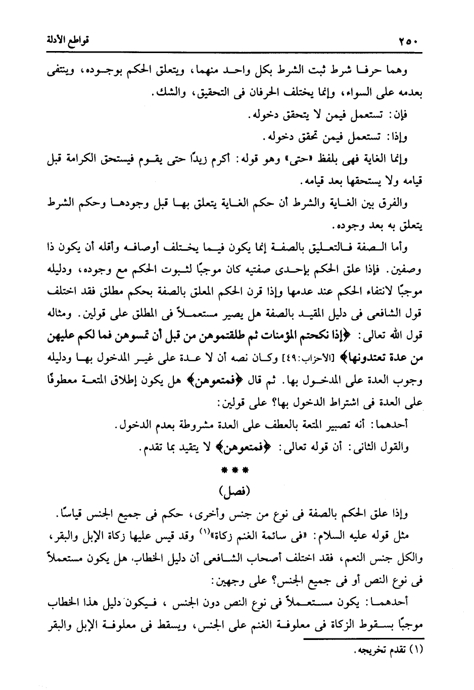 وأما الصفة فالتعليق بالصفة إنما يكون فيما يختلف أوصافه وأقله أن يكون ذا وصفين فإذا علق الحكم بإحدى صفتيه كان موجبا لثبوت الحكم مع وجوده ودليله موجبا لانتفاء الحكم عند عدمها وإذا قرن الحكم المعلق بالصفة بحكم مطلق فقد اختلف قول الشافعى فى دليل المقيد بالصفة هل يصير مستعملا فى المطلق على قولين ومثاله قول الله تعالى: {إِذَا نَكَحْتُمُ الْمُؤْمِنَاتِ ثُمَّ طَلَّقْتُمُوهُنَّ مِنْ قَبْلِ أَنْ تَمَسُّوهُنَّ فَمَا لَكُمْ عَلَيْهِنَّ مِنْ عِدَّةٍ تَعْتَدُّونَهَا} [الأحزاب: 49] وكان نصه أن لا عدة على غير المدخول بها ودليله وجوب العدة على المدخول بها ثم قال: {فَمَتِّعُوهُنَّ} هل يكون إطلاق المتعة معطوفا على العدة فى اشتراط الدخول بها على قولين.