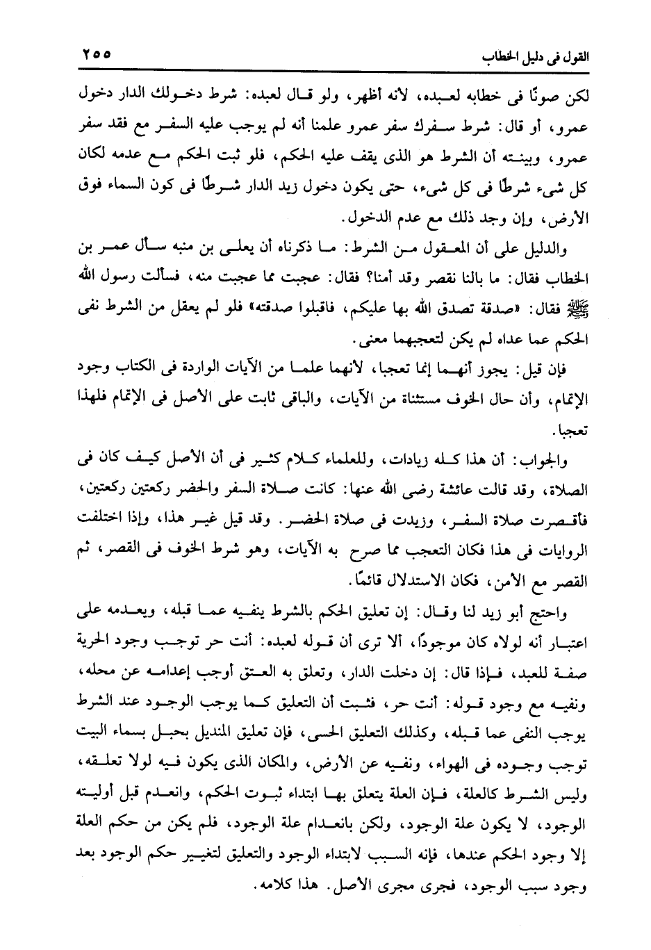 لكن صونا فى خطابه لعبده لأنه أظهر ولو قال لعبده شرط دخولك الدار دخول عمرو أو قال شرط سفرك سفر عمرو علمنا أنه لم يوجب عليه السفر مع فقد سفر عمرو وبينته أن الشرط هو الذى يقف عليه الحكم فلو ثبت الحكم مع عدمه لكان كل شىء شرطا فى كل شىء حتى يكون دخول زيد الدار شرطا فى كون السماء فوق الأرض وأن وجد ذلك مع عدم الدخول.