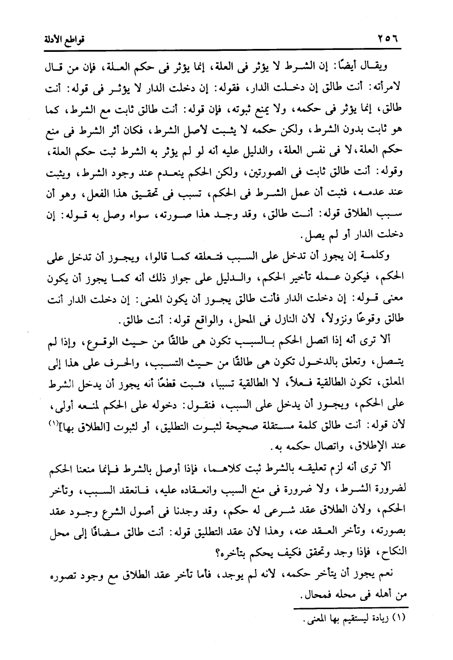 ويقال أيضا أن الشرط لا يؤثر فى العلة إنما يؤثر فى حكم العلة فإن من قال لامرأته أنت طالق أن دخلت الدار فقوله أن دخلت الدار لا يؤثر فى قوله أنت طالق إنما يؤثر فى حكمه ولا يمنع ثبوته فإن قوله أنت طالق ثابت مع الشرط كما هو ثابت بدون الشرط ولكن حكمه لا يثبت لأصل الشرط فكان أثر الشرط فى منع حكم العلة لا فى نفس العلة والدليل عليه أنه لو لم يؤثر به الشرط ثبت حكم العلة وقوله أنت طالق ثابت فى الصورتين ولكن الحكم ينعدم عند وجود الشرط ويثبت عند عدمه فثبت أن عمل الشرط فى الحكم تسبب فى تحقيق هذا الفعل وهو أن سبب الطلاق قوله أنت طالق وقد وجد هذا صورته سواء وصل به قوله أن دخلت الدار أو لم يصل.