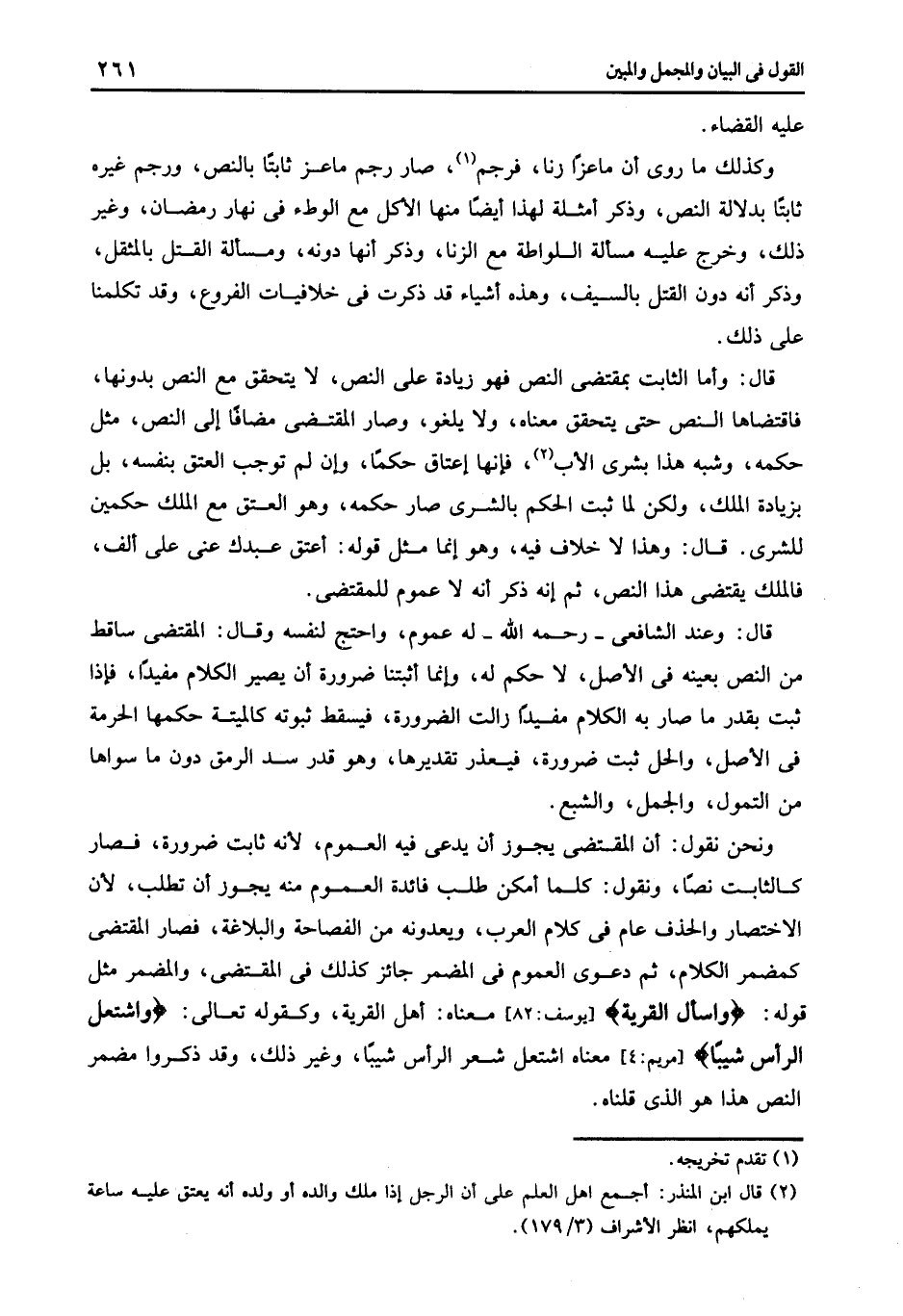 ونحن نقول أن المقتضى يجوز أن يدعى فيه العموم لأنه ثابت ضرورة فصار كالثابت نصا ونقول كلما أمكن طلب فائدة العموم منه يجوز أن تطلب لأن الاختصار والحذف عام فى كلام العرب ويعدونه من الفصاحة والبلاغة فصار المقتضى كمضمر الكلام ثم دعوى العموم فى المضمر جائز كذلك فى المقتضى والمضمر مثل قوله: {وَاسْأَلِ الْقَرْيَةَ} [يوسف: 82] معناه أهل القرية وكقوله تعالى: {وَاشْتَعَلَ الرَّأْسُ شَيْباً} [مريم: 4] معناه اشتعل شعر الرأس شيبا وغير ذلك وقد ذكروا مضمر النص هذا هو الذى قلناه.