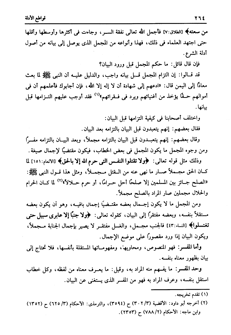 مِنْ سَعَتِهِ} [الطلاق: 7] فأجمل الله تعالى نفقة السر وجاءت فى أكثرها وأوسطها وأقلها حتى اجتهد العلماء فى ذلك فهذا وأنواعه من المجمل الذى يوصل إلى بيانه من أصول أدلة الشرع.