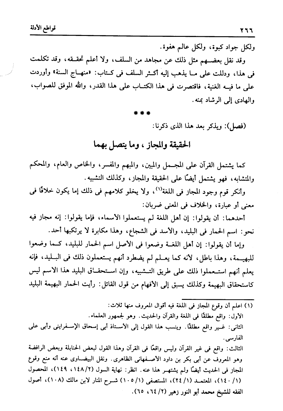 وإما أن يقولوا أن أهل اللغة وضعوا فى الأصل اسم الحمار للبليد كما وضعوا للبهيمة وهذا باطل لأنه كما يعلم لم يضطرد أنهم يستعملون ذلك فى البليد فإنه يعلم أنهم استعملوا ذلك على طريق التشبيه وأن استحقاق البليد هذا الاسم ليس كاستحقاق البهيمة وكذلك يسبق إلى الأفهام من قول القائل رأيت الحمار البهيمة البليد.