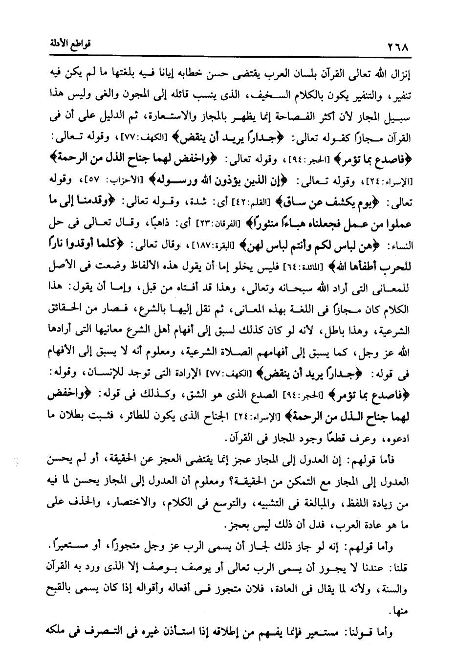 إنزال الله تعالى القرآن بلسان العرب يقتضى حسن خطابه إيانا فيه بلغتها ما لم يكن فيه تنفير والتنفير يكون بالكلام السخيف الذى ينسب قائله إلى المجون والغى وليس هذا سبيل المجاز لأن أكثر الفصاحة إنما يظهر بالمجاز والاستعارة ثم الدليل على أن فى القرآن مجازا كقوله تعالى: {جِدَاراً يُرِيدُ أَنْ يَنْقَضَّ} [لكهف: 77] وقوله تعالى: {فَاصْدَعْ بِمَا تُؤْمَرُ} [الحجر: 94] وقوله تعالى واخفض لهما جناح الذل من الرحمة الإسراء 24 وقوله تعالى: {إِنَّ الَّذِينَ يُؤْذُونَ اللَّهَ وَرَسُولَهُ} [الأحزاب: 57] وقوله تعالى: {يَوْمَ يُكْشَفُ عَنْ سَاقٍ} [القلم: 42] أى شدة وقوله تعالى: {وَقَدِمْنَا إِلَى مَا عَمِلُوا مِنْ عَمَلٍ فَجَعَلْنَاهُ هَبَاءً مَنْثُوراً} [الفرقان:23] أى ذاهبا وقال تعالى فى حل النساء: {هُنَّ لِبَاسٌ لَكُمْ وَأَنْتُمْ لِبَاسٌ لَهُنَّ} [البقرة: 187] وقال تعالى كلما أوقدوا نارا للحرب أطفأها الله المائدة 64 فليس يخلو أما أن يقول هذه الألفاظ وضعت فى الأصل للمعانى التى أراد الله سبحانه وتعالى وهذا قد أفتاه من قبل وأما أن يقول: هذا الكلام كان مجازا فى اللغة بهذه المعانى ثم نقل إليها بالشرع فصار من الحقائق الشرعية وهذا باطل لأنه لو كان كذلك لسبق إلى أفهام أهل الشرع معانيها التى أرادها الله عز وجل كما يسبق إلى أفهامهم الصلاة الشرعية ومعلوم أنه لا يسبق إلى الأفهام فى قوله: {جِدَاراً يُرِيدُ أَنْ يَنْقَضَّ} [لكهف: 77] الإرادة التى توجد للإنسان وقوله: {فَاصْدَعْ بِمَا تُؤْمَرُ} [الحجر: 94] الصدع الذى هو الشق وكذلك فى قوله: {وَاخْفِضْ لَهُمَا جَنَاحَ الذُّلِّ مِنَ الرَّحْمَةِ} [الاسراء: 24] الجناح الذى يكون للطائر فثبت بطلان ما ادعوه وعرف قطعا وجود المجاز فى القرآن.