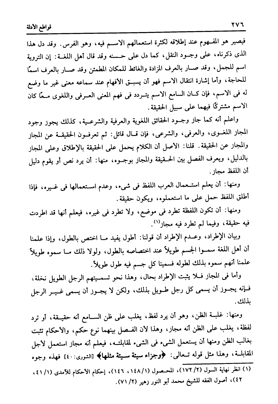 ومنها غلبة الظن وهو أن يرد لفظ يغلب على ظن السامع أنه حقيقة أو ترد لفظة يغلب على الظن أنه مجاز وهذا لأن الفصل بينهما نوع حكم والأحكام تثبت بغالب الظن ومنها أن يستعمل الشىء فى الشىء لمقابلته فيعلم أنه مجاز استعمل لأجل المقابلة وهذا مثل قوله تعالى: {وَجَزَاءُ سَيِّئَةٍ سَيِّئَةٌ مِثْلُهَا} [الشورى: 40] فهذه وجوه.