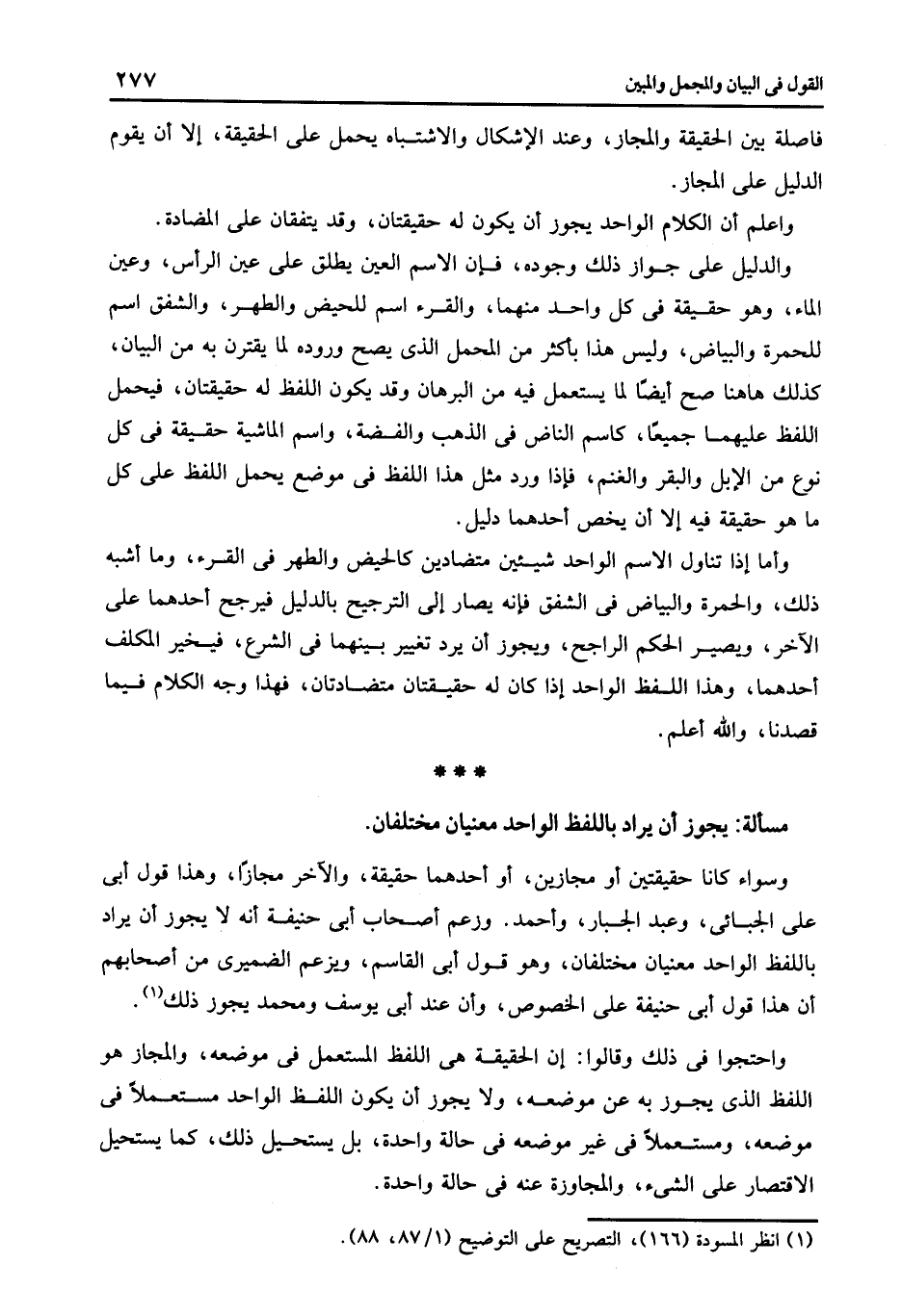 وأما إذا تناول الاسم الواحد شيئين متضادين كالحيض والطهر فى القرء وما أشبه ذلك والحمرة والبياض فى الشفق فإنه يصار إلى الترجيح بالدليل فيرجح أحدهما على الآخر ويصير الحكم الراجح ويجوز أن يرد تغيير بنيهما فى الشرع فيخير المكلف أحدهما وهذا اللفظ الواحد إذا كان له حقيقتان متضادتان فهذا وجه الكلام فيما قصدنا والله أعلم.