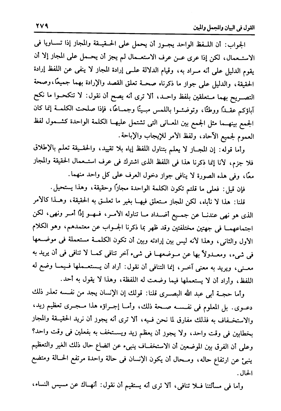 وأما حجة أبى عبد الله البصرى قلنا قولك أن الإنسان يجد من نفسه تعذر ذلك دعوى بل المعلوم فى نفسه صحة ذلك وأما إجراؤه هذا مجرى تعظيم زيد والاستخفاف به فذلك مفارق لما نحن فيه إلا ترى أنه يجوز أن نريد الحقيقة والمجاز بخطابين فى وقت واحد ولا يجوز أن يعظم زيد ويستخف به بفعلين فى وقت واحد وعلى أن الفرق بين الموضعين أن الاستخفاف ينبىء عن اتضاع حال ذلك الغير والتعظيم ينبىء عن ارتفاع حاله ومحال أن يكون الإنسان فى حالة واحدة مرتفع الحالة ومتضع الحال وأما فى مسألتنا فلا تنافى إلا ترى أنه يستقيم أن نقول أنهاك عن مسيس النساء.