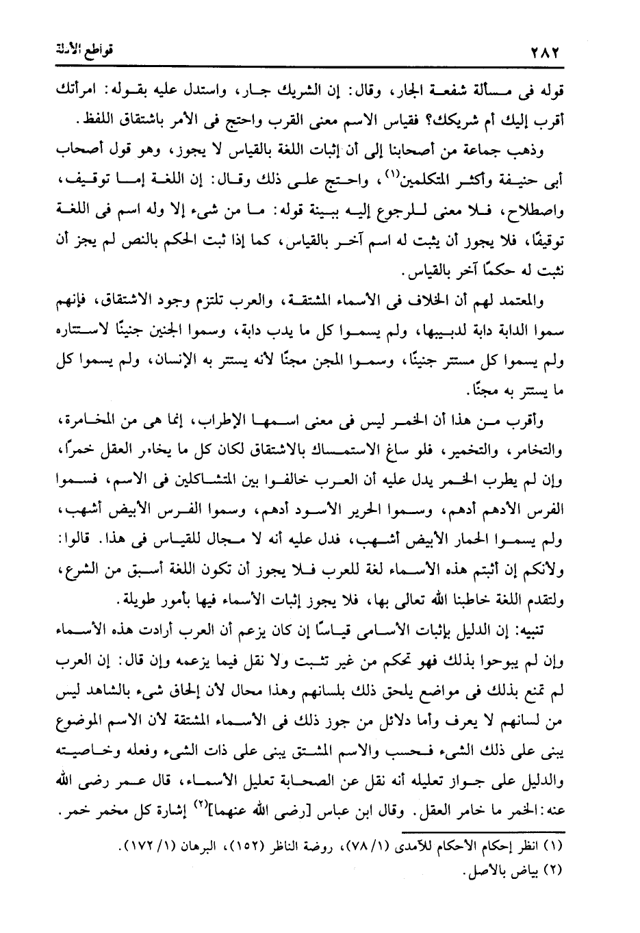 وأقرب من هذا أن الخمر ليس فى معنى اسمها الإطراب إنما هى من المخامرة والتخأمر والتخمير فلو ساغ الاستمساك بالاشتقاق لكان كل ما يخأمر العقل خمرا وأن لم يطرب الخمر يدل عليه أن العرب خالفوا بين المتشاكلين فى الاسم فسموا الفرس الأدهم أدهم وسموا الحرير الأسود أدهم وسموا الفرس الأبيض أشهب ولم يسموا الحمار الأبيض أشهب فدل عليه أنه لا مجال للقياس فى هذا.