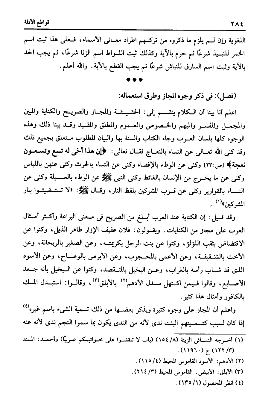 اعلم أنا بينا أن الكلام ينقسم إلى الحقيقة والمجاز والصريح والكناية والمبين والمجمل والمفسر والمبهم والخصوص والعموم والمطلق والمقيد وقد بينا ذلك وهذه الوجوه كلها بلسان العرب وجاء الكتاب والسنة بها والبيان المطلوب متعلق بجميع ذلك وقد كنى الله تعالى عن النساء بالنعاج فقال تعالى: {إِنَّ هَذَا أَخِي لَهُ تِسْعٌ وَتِسْعُونَ نَعْجَةً} [صّ: 23] وكنى عن الوطء بالإفضاء وكنى عن النساء بالحرث وكنى عنهن باللباس وكنى عن ما يخرج من الإنسان بالغائط وكنى النبي صلى الله عليه وسلم عن الوطء بالعسيلة وكنى عن النساء بالقوارير وكنى عن قرب المشركين بلفظ النار وقال صلى الله عليه وسلم: "لا تستضيئوا بنار المشركين" 1.