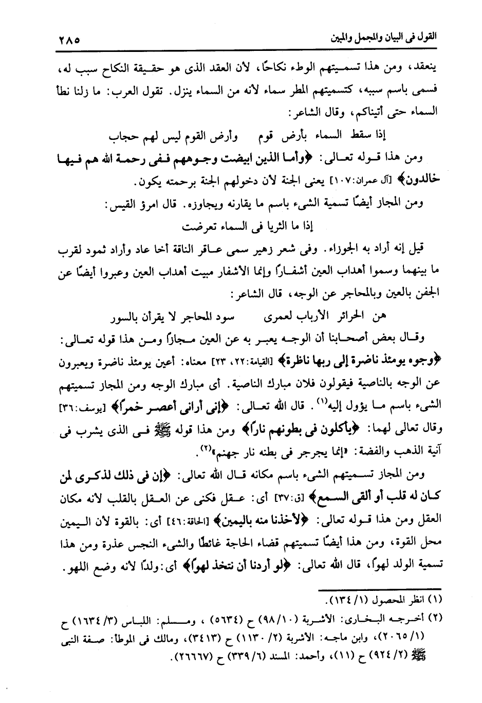 وقال بعض أصحابنا أن الوجه يعبر به عن العين مجازا ومن هذا قوله تعالى: {وُجُوهٌ يَوْمَئِذٍ نَاضِرَةٌ، إِلَى رَبِّهَا نَاظِرَةٌ} [القيامة:23] معناه أعين يومئذ ناضرة ويعبرون عن الوجه بالناصية فيقولون فلان مبارك الناصية أى مبارك الوجه ومن المجاز تسميتهم الشىء باسم ما يؤول إليه1 قال الله تعالى: {إِنِّي أَرَانِي أَعْصِرُ خَمْراً} [يوسف: 36] وقال تعالى لهما يأكلون في بطونهم نارا ومن هذا قوله صلى الله عليه وسلم فى الذى يشرب فى آنية الذهب والفضة: "إنما يجرجر فى بطنه نار جنهم" 2.