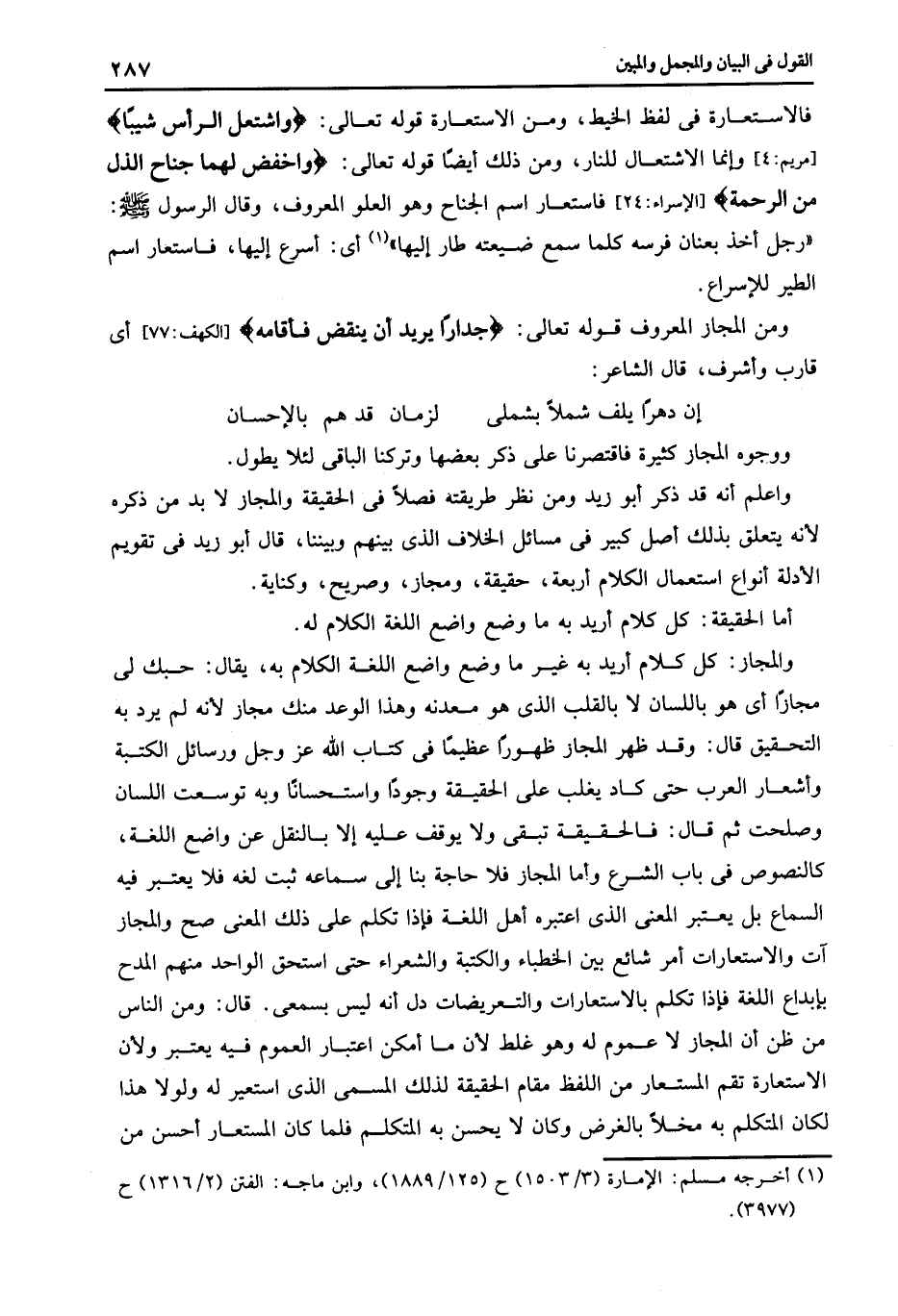 والمجاز كل كلام أريد به غير ما وضع واضع اللغة الكلام به يقال حبك لى مجازا أى هو باللسان لا بالقلب الذى هو معدنه وهذا الوعد منك مجاز لأنه لم يرد به التحقيق قال وقد ظهر المجاز ظهورا عظيما فى كتاب الله عز وجل ورسائل الكتبة وأشعار العرب حتى كاد يغلب على الحقيقة وجودا واستحسانا وبه توسعت اللسان وصلحت ثم قال فالحقيقة تبقى ولا يوقف عليه إلا بالنقل عن واضع اللغة كالنصوص فى باب الشرع وأما المجاز فلا حاجة بنا إلى سماعه ثبت لغه فلا يعتبر فيه السماع بل يعتبر المعنى الذى اعتبره أهل اللغة فإذا تكلم على ذلك المعنى صح والمجاز آت والاستعارات أمر شائع بين الخطباء والكتبة والشعراء حتى استحق الواحد منهم المدح بإبداع اللغة فإذا تكلم بالاستعارات والتعريضات دل أنه ليس بسمعى قال ومن الناس من ظن أن المجاز لا عموم له وهو غلط لأن ما أمكن اعتبار العموم فيه يعتبر ولأن الاستعارة تقم المستعار من اللفظ مقام الحقيقة لذلك المسمى الذى استعير له ولولا هذا لكان المتكلم به مخلا بالغرض وكان لا يحسن به المتكلم فلما كان المستعار أحسن من.