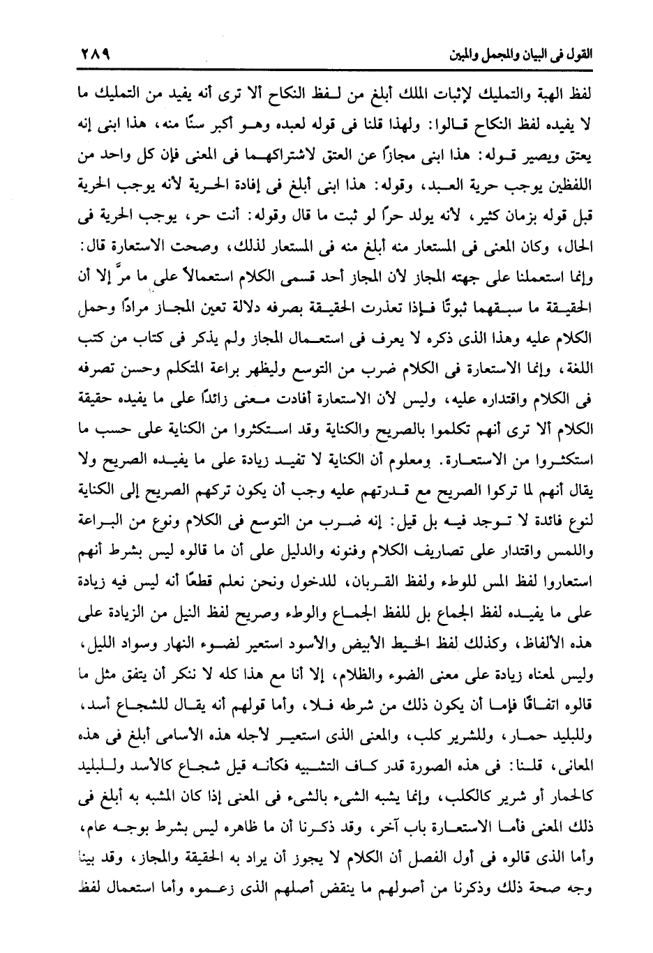 لفظ الهبة والتمليك لإثبات الملك أبلغ من لفظ النكاح إلا ترى أنه يفيد من التمليك ما لا يفيده لفظ النكاح قالوا: ولهذا قلنا فى قوله لعبده وهو أكبر سنا منه هذا ابنى أنه يعتق ويصير قوله هذا ابنى مجازا عن العتق لاشتراكهما فى المعنى فإن كل واحد من اللفظين يوجب حرية العبد وقوله هذا ابنى أبلغ فى إفادة الحرية لأنه يوجب الحرية قبل قوله بزمان كثير لأنه يولد حرا لو ثبت ما قال وقوله أنت حر يوجب الحرية فى الحال وكان المعنى فى المستعار منه أبلغ منه فى المستعار لذلك وصحت الاستعارة قال وإنما استعملنا على جهته المجاز لأن المجاز أحد فسمى الكلام استعمالا على ما مر إلا أن الحقيقة ما سبقهما ثبوتا فإذا تعذرت الحقيقة بصرفه دلالة تعين المجاز مرادا وحمل الكلام عليه وهذا الذى ذكره لا يعرف فى استعمال المجاز ولم يذكر فى كتاب من كتب اللغة وإنما الاستعارة فى الكلام ضرب من التوسع وليظهر براعة المتكلم وحسن تصرفه في الكلام واقتداره عليه وليس لأن الاستعارة أفادت معنى زائدا على ما يفيده حقيقة الكلام إلا ترى أنهم تكلموا بالصريح والكناية وقد استكثروا من الكناية على حسب ما استكثروا من الاستعارة ومعلوم أن الكناية لا تفيد زيادة على ما يفيده الصريح ولا يقال أنهم لما تركوا الصريح مع قدرتهم عليه وجب أن يكون تركهم الصريح إلى الكناية لنوع فائدة لا توجد فيه بل قيل أنه ضرب من التوسع فى الكلام ونوع من البراعة واللمس واقتدار على تصاريف الكلام وفنونه والدليل على أن ما قالوه ليس بشرط أنهم استعاروا لفظ المس للوطء ولفظ القربان للدخول ونحن نعلم قطعا أنه ليس فيه زيادة على ما يفيده لفظ الجماع بل للفظ الجماع والوطء وصريح لفظ النيل من الزيادة على هذه الألفاظ وكذلك لفظ الخيط الأبيض والأسود استعير لضوء النهار وسواد الليل وليس لمعناه زيادة على معنى الضوء والظلام إلا أنا مع هذا كله لا ننكر أن يتفق مثل ما قالوه اتفاقا فإما أن يكون ذلك من شرطه فلا وأما قولهم أنه يقال للشجاع أسد وللبليد حمار وللشرير كلب والمعنى الذى استعير لأجله هذه الأسامى أبلغ فى هذه المعانى قلنا فى هذه الصورة قدر كاف التشبيه فكأنه قيل شجاع كالأسد وللبليد كالحمار أو شرير كالكلب وإنما يشبه الشىء بالشىء فى المعنى إذا كان المشبه به أبلغ فى ذلك المعنى فأما الاستعارة باب آخر وقد ذكرنا أن ما ظاهره ليس بشرط بوجه عام وأما الذى قالوه فى أول الفصل أن الكلام لا يجوز أن يراد به الحقيقة والمجاز وقد بينا وجه صحة ذلك وذكرنا من أصولهم ما ينقض أصلهم الذى زعموه وأما استعمال لفظ.