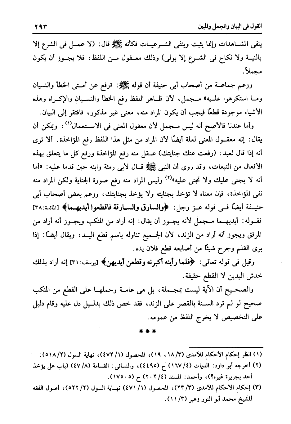 وأما عندنا فالأصح أنه ليس مجمل لأن معقول المعنى فى الاستعمال1 ويمكن أن يقال أنه معقول المعنى لعلة أيضا لأن المراد من مثل هذا اللفظ رفع المؤأخذة ألا ترى أنه إذا قال لعبد رفعت عنك جنايتك عقل منه رفع المؤأخذة ورفع كل ما يتعلق بهذه الأفعال من التبعات وقد روى أن النبي صلى الله عليه وسلم قال لأبى رمثة وابنه حين قدما عليه: " أما أنه لا يجنى عليك ولا تجنى عليه" 2 وليس المراد منه رفع صورة الجناية ولكن المراد منه نفى المؤأخذة فإن معناه لا تؤخذ بجنايته ولا يؤخذ بجنايتك وزعم بعض أصحاب أبى حنيفة أيضا فى قوله عز وجل: {وَالسَّارِقُ وَالسَّارِقَةُ فَاقْطَعُوا أَيْدِيَهُمَا} [المائدة: 38] فقوله أيديهما مجمل لأنه يجوز أن يقال أنه أراد من المنكب ويجوز أنه أراد من المرفق ويجوز أنه أراد من الزند لأن الجميع تناوله باسم قطع اليد ويقال أيضا إذا برى القلم وجرح شيئا من أصابعه قطع فلان يده.