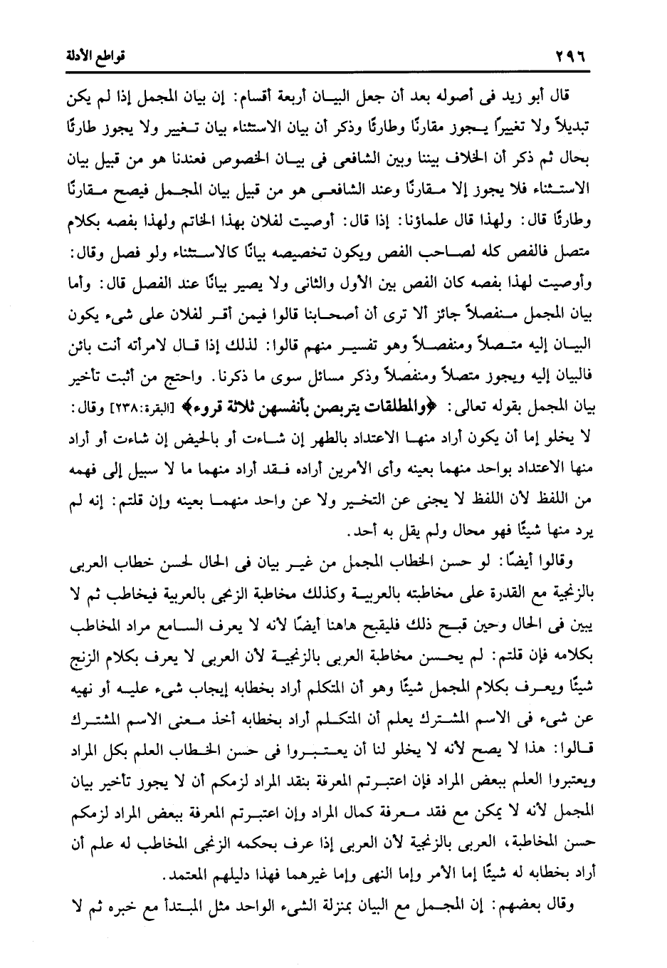 وقالوا: أيضا لو حسن الخطاب المجمل من غير بيان فى الحال لحسن خطاب العربى بالزنجية مع القدرة على مخاطبته بالعربية وكذلك مخاطبة الزنجى بالعربية فيخاطب ثم لا يبين فى الحال وحين قبح ذلك فليقبح هاهنا أيضا لأنه لا يعرف السامع مراد المخاطب بكلامه فإن قلتم لم يحسن مخاطبة العربى بالزنجية لأن العربى لا يعرف بكلام الزنج شيئا ويعرف بكلام المجمل شيئا وهو أن المتكلم أراد بخطابه إيجاب شىء عليه أو نهيه عن شىء فى الاسم المشترك يعلم أن المتكلم أراد بخطابه أخذ معنى الاسم المشترك قالوا: هذا لا يصح لأنه لا يخلو لنا أن يعتبروا فى حسن الخطاب العلم بكل المراد ويعتبروا العلم ببعض المراد فإن اعتبرتم المعرفة بنقد المراد لزمكم أن لا يجوز تأخير بيان المجمل لأنه لا يمكن مع فقد معرفة كمال المراد وأن اعتبرتم المعرفة ببعض المراد لزمكم حسن المخاطبة العربى بالزنجية لأن العربى إذا عرف بحكمه الزنجى المخاطب له علم أن أراد بخطابه له شيئا أما الأمر وأما النهى وأما غيرهما فهذا دليلهم المعتمد.