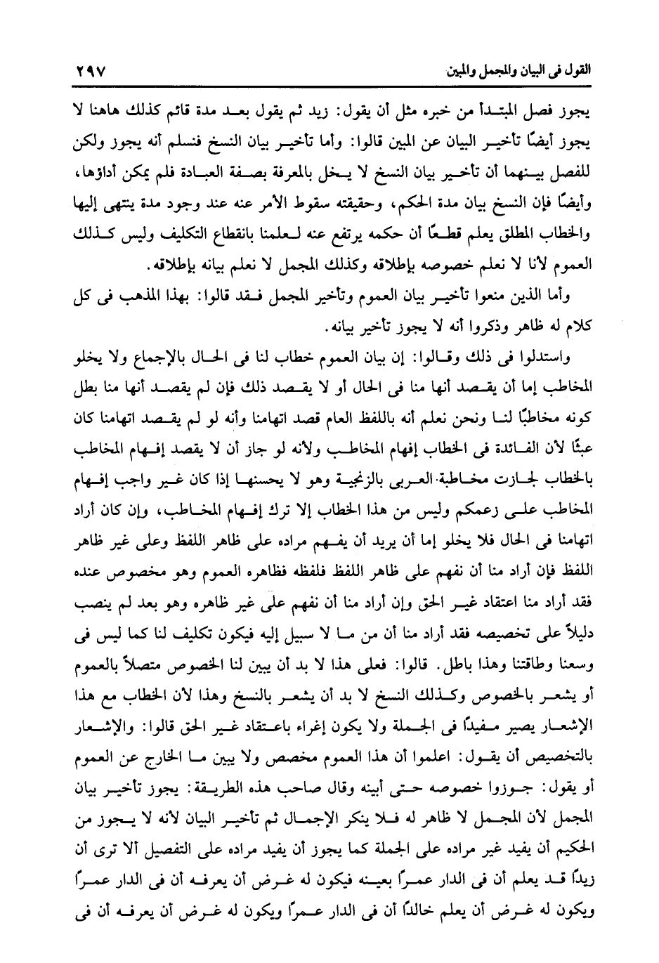 واستدلوا فى ذلك وقالوا: أن بيان العموم خطاب لنا فى الحال بالإجماع ولا يخلو المخاطب أما أن يقصد أنها منا فى الحال أو لا يقصد ذلك فإن لم يقصد أنها منا بطل كونه مخاطبا لنا ونحن نعلم أنه باللفظ العام قصد اتهامنا وأنه لو لم يقصد اتهامنا كان عبثا لأن الفائدة فى الخطاب إفهام المخاطب ولأنه لو جاز لا يقصد إفهام المخاطب بالخطاب لجازت مخاطبة العربى بالزنجية وهو لا يحسنها إذا كان غير واجب إفهام المخاطب على زعمكم وليس من هذا الخطاب إلا ترك إفهام المخاطب وأن كان أراد اتهامنا فى الحال فلا يخلو أما أن يريد أن يفهم مراده على ظاهر اللفظ وعلى غير ظاهر اللفظ فإن أراد منا أن نفهم على ظاهر اللفظ فلفظه فظاهره العموم وهو مخصوص عنده فقد أراد منا اعتقاد غير الحق وأن أراد منا أن نفهم على غير ظاهره وهو بعد لم ينصب دليلا على تخصيصه فقد أراد منا أن من ما لا سبيل إليه فيكون تكليف لنا كما ليس فى وسعنا وطاقتنا وهذا باطل قالوا: فعلى هذا لا بد أن يبين لنا الخصوص متصلا بالعموم أو يشعر بالخصوص وكذلك النسخ لا بد أن يشعر بالنسخ وهذا لأن الخطاب مع هذا الإشعار يصير مفيدا فى الجملة ولا يكون إغراء باعتقاد غير الحق قالوا: والإشعار بالتخصيص أن يقول: اعلموا أن هذا العموم مخصص لا يبين ما الخارج عن العموم أو يقول: جوزوا خصوصه حتى أبينه وقال صاحب هذه الطريقة يجوز تأخير بيان المجمل لأن المجمل لا ظاهر له فلا ينكر الإجمال ثم تأخير البيان لأنه لا يجوز من الحكيم أن يفيد غير مراده على الجملة كما يجوز أن يفيد مراده على التفصيل إلا ترى أن زيدا قد يعلم أن فى الدار عمرا بعينه فيكون له غرض أن يعرفه أن فى الدار عمرا ويكون له غرض أن يعلم خالدا أن فى الدار عمرا ويكون له غرض أن يعرفه أن فى