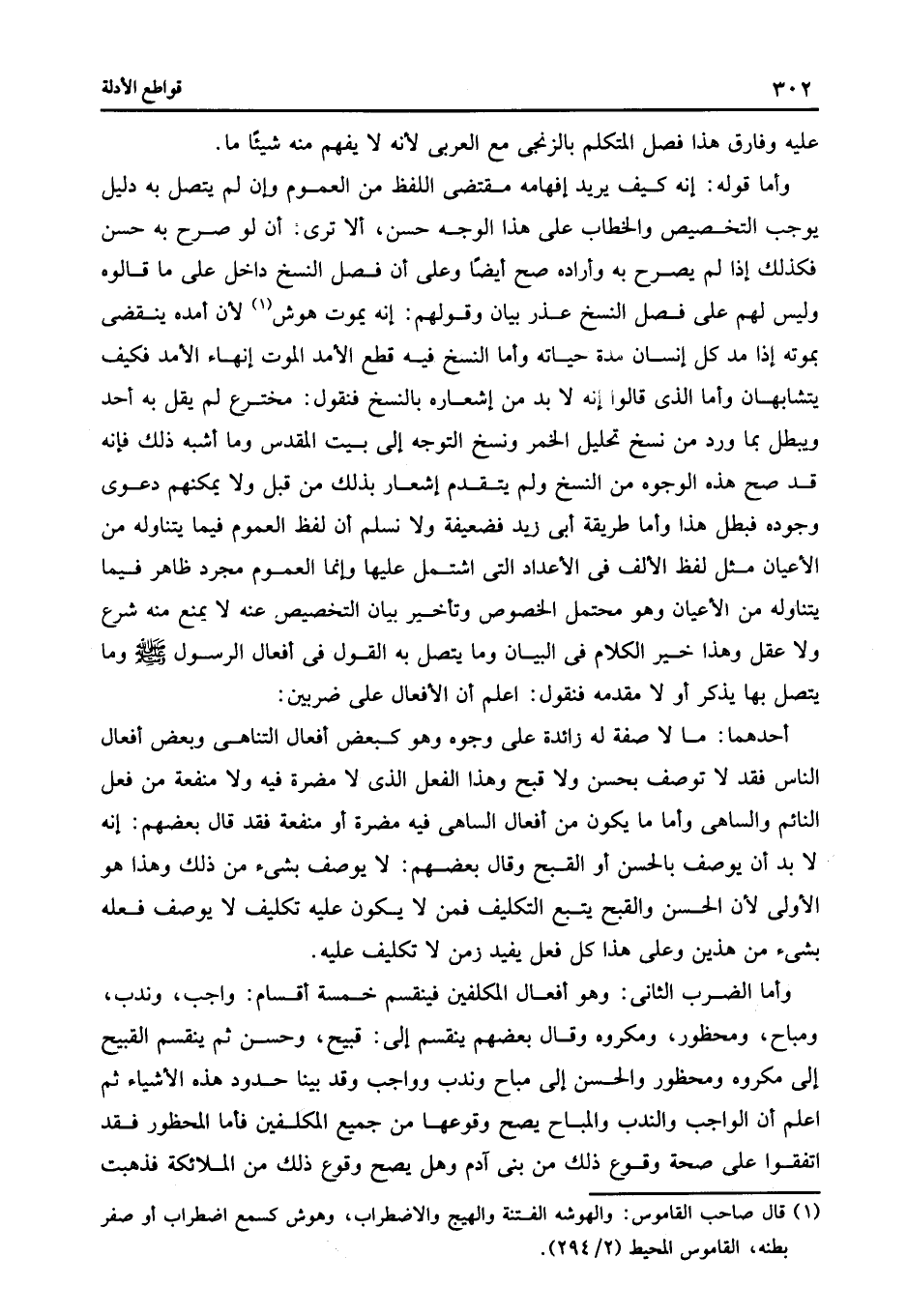 وأما قوله أنه كيف يريد إفهامه مقتضى اللفظ من العموم وأن لم يتصل به دليل يوجب التخصيص والخطاب على هذا الوجه حسن إلا ترى أن لو صرح به حسن فكذلك إذا لم يصرح به وأراده صح أيضا وعلى أن فصل النسخ داخل على ما قالوه وليس لهم على فصل النسخ عذر بيان وقولهم أنه يموت هوش لأن أمده ينقضى بموته إذا مد كل إنسان مدة حياته وأما النسخ فيه قطع الأمد الموت إنهاء الأمد فكيف يتشابهان وأما الذى قالوا: أنه لا بد من إشعاره بالنسخ فنقول مخترع لم يقل به أحد ويبطل بما ورد من نسخ تحليل الخمر ونسخ التوجه إلى بيت المقدس وما أشبه ذلك فإنه قد صح هذه الوجوه من النسخ ولم يتقدم إشعار بذلك من قبل ولا يمكنهم دعوى وجوده فبطل هذا وأما طريقة أبى زيد فضعيفة ولا نسلم أن لفظ العموم فيما يتناوله من الأعيان مثل لفظ الألف فى الأعداد التى اشتمل عليها وإنما العموم مجرد ظاهر فيما يتناوله من الأعيان وهو محتمل الخصوص وتأخير بيان التخصيص عنه لا يمنع منه شرع ولا عقل وهذا خير الكلام فى البيان وما يتصل به القول فى أفعال الرسول صلى الله عليه وسلم وما يتصل بها يذكر أو لا مقدمة فنقول اعلم أن الأفعال على ضربين.