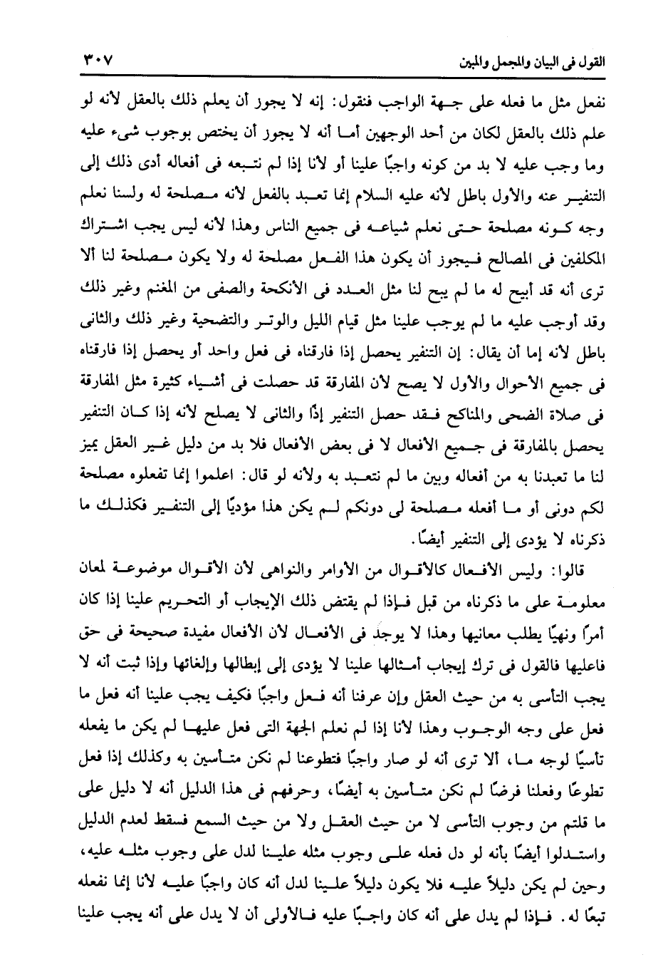 قالوا: وليس الأفعال كالأقوال من الأوامر والنواهى لأن الأقوال موضوعة لمعان معلومة على ما ذكرناه من قبل فإذا لم يقتض ذلك الإيجاب أو التحريم علينا إذا كان أمرا ونهيا يطلب معانيها وهذا لا يوجد فى الأفعال لأن الأفعال مفيدة صحيحة فى حق فاعليها فالقول فى ترك إيجاب أمثالها علينا لا يؤدى إلى إبطالها وإلغائها وإذا ثبت أنه لا يجب التأسى به من حيث العقل وأن عرفنا أنه فعل واجبا فكيف يجب علينا أنه فعل ما فعل على وجه الوجوب وهذا لأنا إذا لم نعلم الجهة التى فعل عليها لم يكن ما يفعله تأسيا لوجه ما إلا ترى أنه لو صار واجبا فتطوعنا لم نكن متأسين به وكذلك إذا فعل تطوعا وفعلنا فرضا لم نكن متأسين به أيضا وحرفهم فى هذا الدليل أنه لا دليل على ما قلتم من وجوب التأسى لا من حيث العقل ولا من حيث السمع فسقط لعدم الدليل واستدلوا أيضا بأنه لو دل فعله على وجوب مثله علينا لدل على وجوب مثله عليه وحين لم يكن دليلا عليه فلا يكون دليلا علينا لدل أنه كان واجبا عليه لأنا إنما نفعله تبعا له فإذا لم يدل على أنه كان واجبا عليه فالأولى أن لا يدل على أنه يجب علينا.