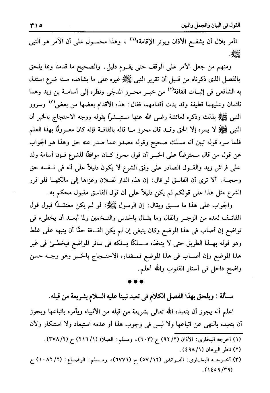 اعلم أنه يجوز أن يتعبده الله تعالى بشريعة من قبله من الأنبياء ويأمره باتباعها ويجوز أن يتعبده بالنهى عن اتباعها ولا لبس فى وجوب هذا أو عدمه استبعاد ولا استنكار ولأن.