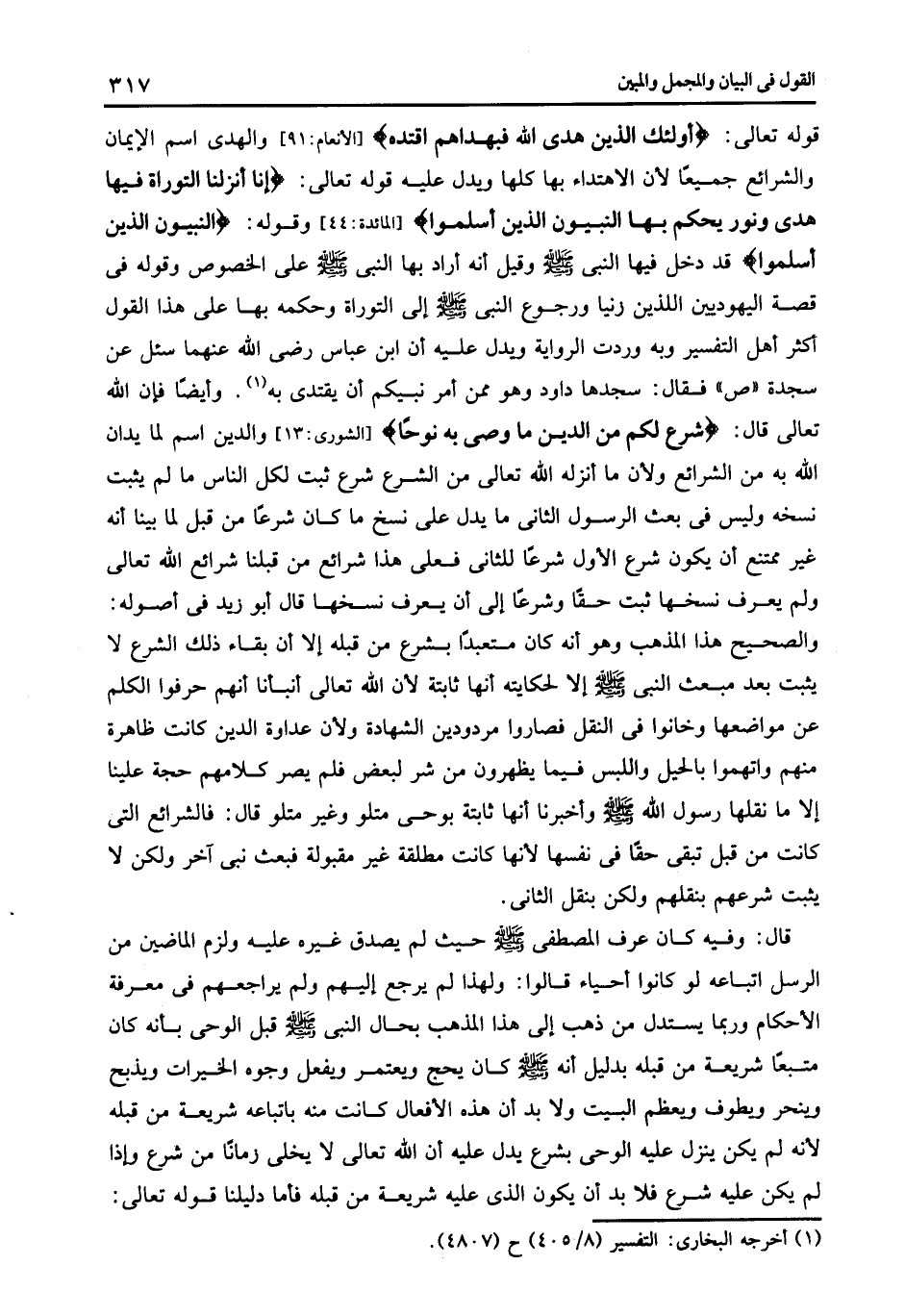قوله تعالى: {أُولَئِكَ الَّذِينَ هَدَى اللَّهُ فَبِهُدَاهُمُ اقْتَدِهْ} [الأنعام: 90] والهدى اسم الإيمان والشرائع جميعا لأن الاهتداء بها كلها ويدل عليه قوله تعالى: {إِنَّا أَنْزَلْنَا التَّوْرَاةَ فِيهَا هُدىً وَنُورٌ يَحْكُمُ بِهَا النَّبِيُّونَ الَّذِينَ أَسْلَمُوا} [المائدة: 44] وقوله النبيون الذين أسلموا قد دخل فيها النبي صلى الله عليه وسلم وقيل أنه أراد بها النبي صلى الله عليه وسلم على الخصوص وقوله فى قصة اليهوديين اللذين زنيا ورجوع النبي صلى الله عليه وسلم إلى التوراة وحكمه بها على هذا القول أكثر أهل التفسير وبه وردت الرواية ويدل عليه أن ابن عباس رضى الله عنهما سئل عن سجدة ص فقال سجدها داود وهو ممن أمر نبيكم أن يقتدى به1 وأيضا فإن الله تعالى قال: {شَرَعَ لَكُمْ مِنَ الدِّينِ مَا وَصَّى بِهِ نُوحاً} [الشورى: 13] والدين اسم لما يدان الله به من الشرائع ولأن ما أنزله الله تعالى من الشرع شرع ثبت لكل الناس ما لم يثبت نسخه وليس فى بعث الرسول الثانى ما يدل على نسخ ما كان شرعا من قبل لما بينا أنه غير ممتنع أن يكون شرع الأول شرعا للثانى فعلى هذا شرائع من قبلنا شرائع الله تعالى ولم يعرف نسخها ثبت حقا وشرعا إلى أن يعرف نسخها قال أبو زيد فى أصوله والصحيح هذا المذهب وهو أنه كان متعبدا بشرع من قبله إلا أن بقاء ذلك الشرع لا يثبت بعد مبعث النبي صلى الله عليه وسلم إلا لحكايته أنها ثابتة لأن الله تعالى أنبأنا أنهم حرفوا الكلم عن مواضعها وخانوا فى النقل فصاروا مردودين الشهادة ولأن عداوة الدين كانت ظاهرة منهم واتهموا بالحيل واللبس فيما يظهرون من شر لبعض فلم يصر كلامهم حجة علينا إلا ما نقلها رسول الله صلى الله عليه وسلم وأخبرنا أنها ثابتة بوحى متلو وغير متلو قال فالشرائع التى كانت من قبل تبقى حقا فى نفسها لأنها كانت مطلقة غير مقبولة فبعث نبى آخر ولكن لا يثبت شرعهم بنقلهم ولكن بنقل الثانى.