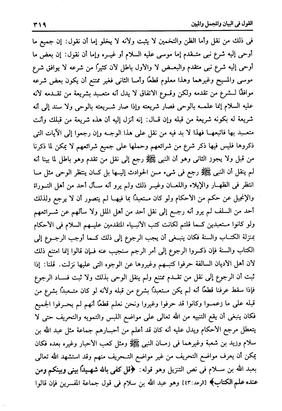 فى ذلك من نقل وأما الظن والتخمين لا يثبت ولأنه لا يخلو أما أن نقول أن جميع ما أوحى إليه شرع نبي متقدم أما موسى عليه السلام أو غيره وأما أن نقول أن بعض ما أوحى إليه شرع نبى متقدم والبعض لا والأول باطل لأن كثيرا من شرعه لا يوافق شرع موسى والمسيح وغيرهما وهذا معلوم قطعا وأما الثانى فغير ممتنع أن يكون بعض شرعه موافقا لشرع من تقدمه ولكن وقوع الاتفاق لا يدل أنه متعبد بشريعة من تقدمه لأنه عليه السلام إنما علمه بالوحى فصار شريعته وإذا صار شريعته بالوحى ولا سند إلى أنه شريعة له بكونه شريعة من قبله وأن قال أنه أنزل إليه أن هذه شريعة من قبلك وأنت متعبد بها فاتبعها فهذا لا بد فيه من نقل على هذا الوجه وأن رجعوا إلى الآيات التى ذكروها فليس فيها ذكر شرع من شرائعهم وحملها على جميع شرائعهم لا يمكن لما ذكرنا من قبل ولا يجوز الثانى وهو أن النبي صلى الله عليه وسلم رجع إلى نقل من تقدم وهو باطل لما بينا أنه لم ينقل أن النبي صلى الله عليه وسلم رجع فى شىء من الحوادث إليها بل كان ينتظر الوحى مثل ما انتظر فى الظهار والإيلاء واللعان وغير ذلك ولم يرو أنه سأل أحد من أهل التوراة والإنجيل عن حكم من الأحكام ولو كان متعبدا بما فيها لم يتصور أن لا يرجع ولذلك أحد من السلف لم يرو أنه رجع إلى نقل أحد من أهل الملل ولا سألهم عن شرائعهم ولو كانوا متعبدين كما قلتم لكانت كتب الأنبياء المتقدمين عليهم السلام فى الأحكام بمنزلة الكتاب والسنة فكان ينبغى أن يجب الرجوع إلى ذلك كما أوجب الرجوع إلى الكتاب والسنة فإن ذكروا الرجوع إلى أمر الرجم سنجيب عنه فإن قالوا: إنما امتنع ذلك لأن أهل الأديان السالفة حرفوا كتبهم وغيروها عن الوجوه التى عليها نزلت قلنا إذا ثبت أن الرجوع إلى نقل من تقدم ممتنع ولم ينقل الوحى بذلك ولا ثبت فساد الرجوع فإذا سقط عرفنا قطعا أنه لم يكن متعبدا بشرع من قبله ولأنه لو كان متعبدا بشرع من قبله على ما زعموا وكانوا قد حرفوا وغيروا ونحن نعلم قطعا أنهم لم يحرفوا الجميع فكان ينبغى أن يقع التنبيه من الله تعالى على مواضع اللبس والتمويه والتحريف حتى لا يتعطل مرجع الأحكام ويدل عليه أنه كان قد أعلم من أحبارهم جماعة مثل عبد الله بن سلام وزيد بن شعبة وغيرهما فى زمان النبي صلى الله عليه وسلم ومثل كعب الأحبار وغيره بعده فكان يمكن أن يعرف مواضع التحريف من غير مواضع التحريف منهم وقد استشهد الله تعالى بعبد الله بن سلام فى نص التنزيل وهو قوله: {قُلْ كَفَى بِاللَّهِ شَهِيداً بَيْنِي وَبَيْنَكُمْ وَمَنْ عِنْدَهُ عِلْمُ الْكِتَابِ} [الرعد: 43] وهو عبد الله بن سلام فى قول جماعة المفسرين فإن قالوا.