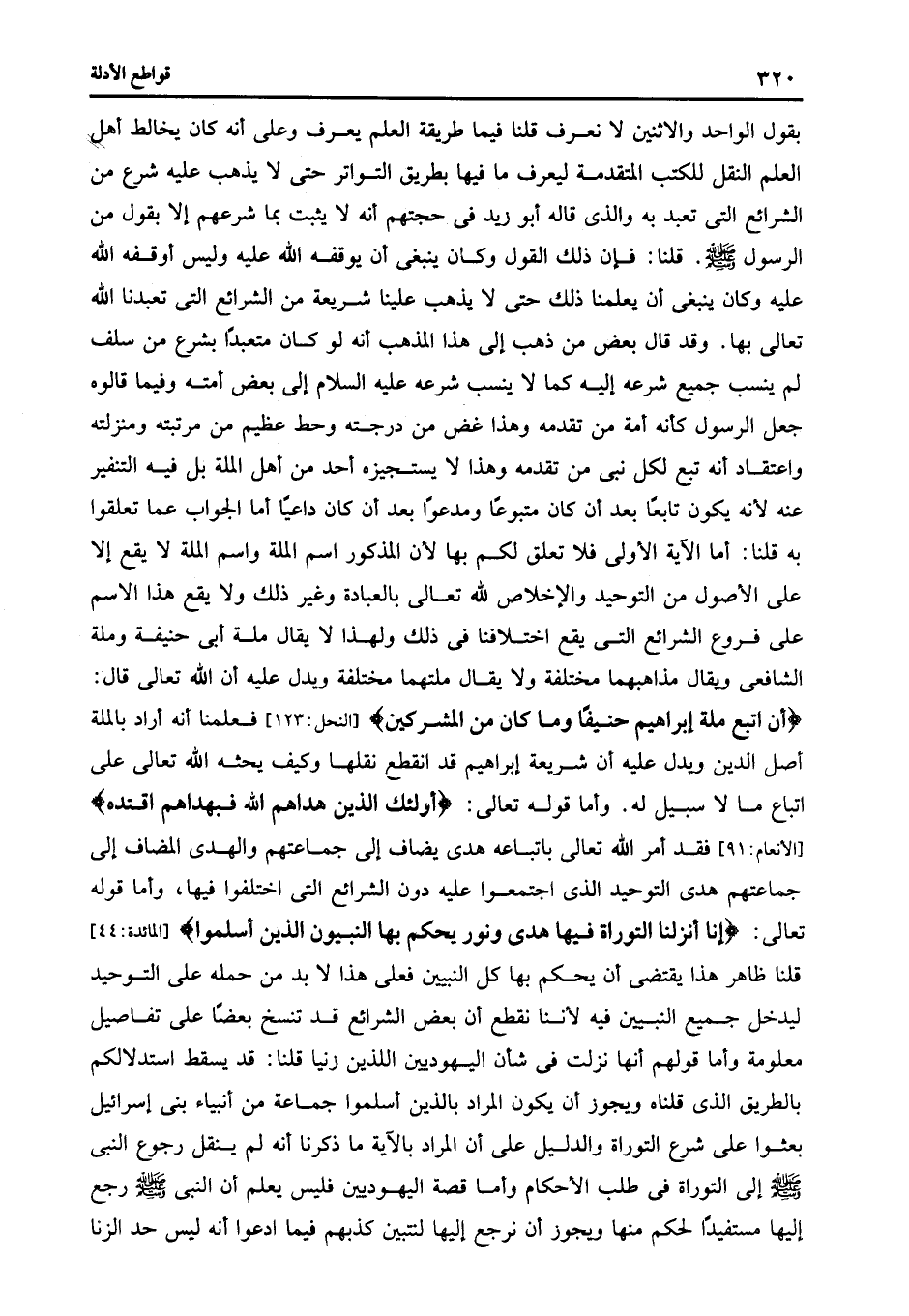 بقول الواحد والاثنين لا نعرف قلنا فيما طريقة العلم يعرف وعلى أنه كان يخالط أهل العلم النقل للكتب المتقدمة ليعرف ما فيها بطريق التواتر حتى لا يذهب عليه شرع من الشرائع التى تعبد به والذى قاله أبو زيد فى حجتهم أنه لا يثبت بما شرعهم إلا بقول من الرسول صلى الله عليه وسلم قلنا فإن ذلك القول وكان ينبغى أن يوقفه الله عليه وليس أوقفه الله عليه وكان ينبغى أن يعلمنا ذلك حتى لا يذهب علينا شريعة من الشرائع التى تعبدنا الله تعالى بها وقد قال بعض من ذهب إلى هذا المذهب أنه لو كان متعبدا بشرع من سلف لم ينسب جميع شرعه إليه كما لا ينسب شرعه عليه السلام إلى بعض أمته وفيما قالوه جعل الرسول كأنه أمة من تقدمه وهذا غض من درجته وحط عظيم من مرتبته ومنزلته واعتقاد أنه تبع لكل نبى من تقدمه وهذا لا يستجيزه أحد من أهل الملة بل فيه التنفير عنه لأنه يكون تابعا بعد أن كان متبوعا ومدعوا بعد أن كان داعيا أما الجواب عما تعلقوا به قلنا أما الآية الأولى فلا تعلق لكم بها لأن المذكور اسم الملة واسم الملة لا يقع إلا على الأصول من التوحيد والإخلاص لله تعالى بالعبادة وغير ذلك ولا يقع هذا الاسم على فروع الشرائع التى يقع اختلافنا فى ذلك ولهذا لا يقال ملة أبى حنيفة وملة الشافعى ويقال مذاهبهما مختلفة ولا يقال ملتهما مختلفة ويدل عليه أن الله تعالى قال: {أَنِ اتَّبِعْ مِلَّةَ إِبْرَاهِيمَ حَنِيفاً وَمَا كَانَ مِنَ الْمُشْرِكِينَ} [النحل: 123] فعلمنا أنه أراد بالملة أصل الدين ويدل عليه أن شريعة إبراهيم قد انقطع نقلها وكيف يحثه الله تعالى على اتباع ما لا سبيل له.