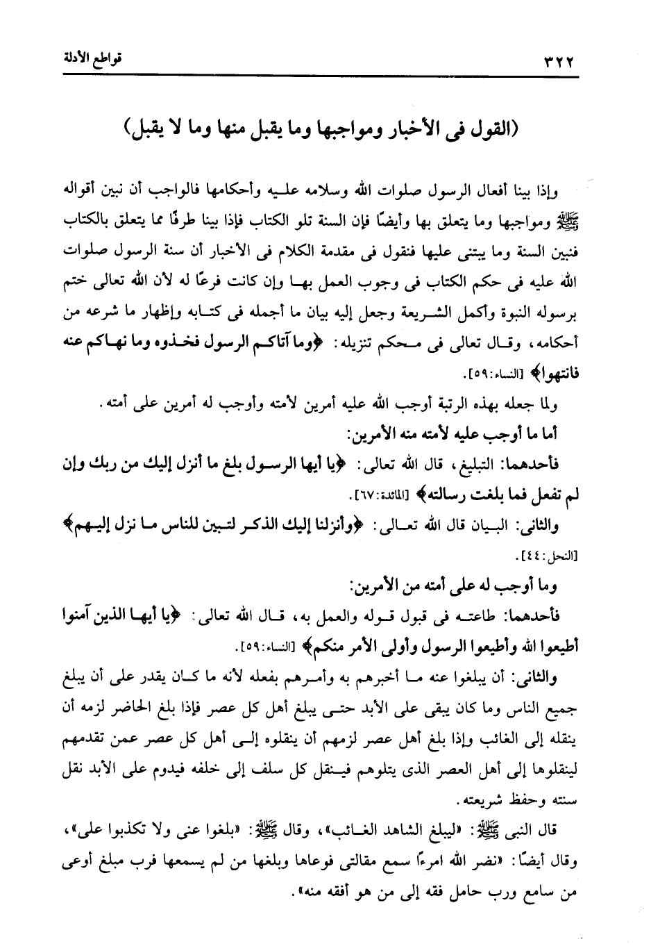 قال النبى صلى الله عليه وسلم: "ليبلغ الشاهد الغائب" وقال صلى الله عليه وسلم: "بلغوا عنى ولا تكذبوا على" وقال أيضا: "نضر الله امرءا سمع مقالتى فوعاها وبلغها من لم يسمعها فرب مبلغ أوعى من سامع ورب حامل فقه إلى من هو أفقه منه".