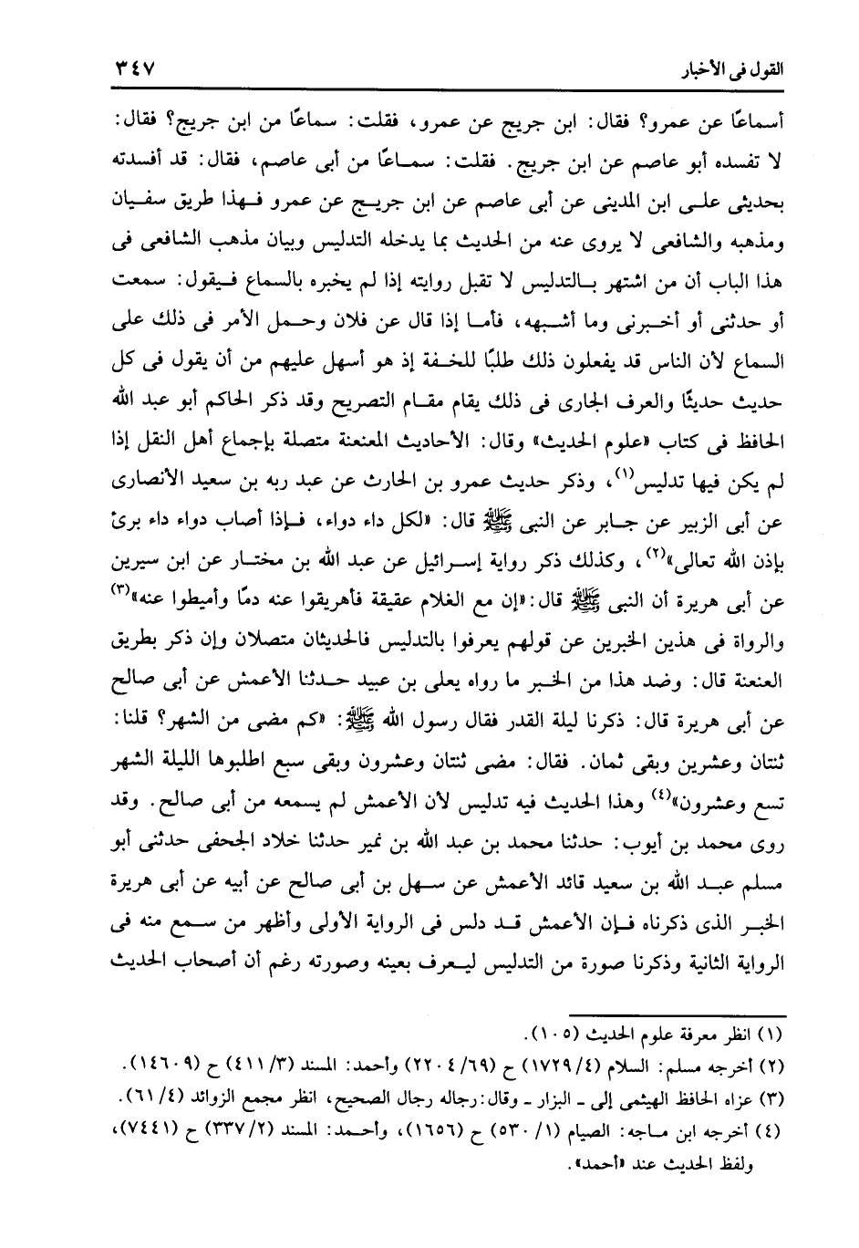 وقد روى محمد بن أيوب حدثنا محمد بن عبد الله بن نمير حدثنا خلاد الجحفى حدثنى أبو مسلم عبد الله بن سعيد قائد الأعمش عن سهل بن أبى صالح عن أبيه عن أبى هريرة الخبر الذى ذكرناه فإن الأعمش قد دلس فى الرواية الأولى وأظهر من سمع منه فى الرواية الثانية وذكرنا صورة من التدليس ليعرف بعينه وصورته رغم أن أصحاب الحديث.