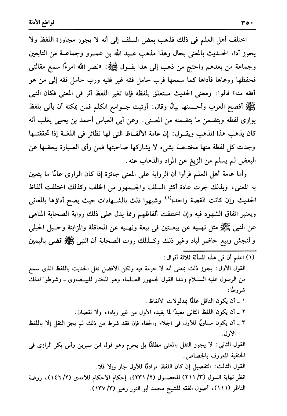 وأما عامة أهل العلم فرأوا أن الرواية على المعنى جائزة إذا كان الراوى عالما ما يتعين به المعنى وبذلك جرت عادة أكثر السلف والجمهور من الخلف وكذلك اختلفت ألفاظ الحديث وأن كانت القصة واحدة1 وشبهوا ذلك بالشهادات حيث يصح أداؤها بالمعانى ويعتبر اتفاق الشهود فيه وأن اختلفت ألفاظهم ومما يدل على ذلك رواية الصحابة المناهى عن النبى صلى الله عليه وسلم مثل نهيه عن بيعتين فى بيعة ونهيه عن المحاقلة والمزابنة وحبل الحبلى والنجش وبيع حاضر لباد وغير ذلك وكذلك روت الصحابة أن النبى صلى الله عليه وسلم قضى باليمين.