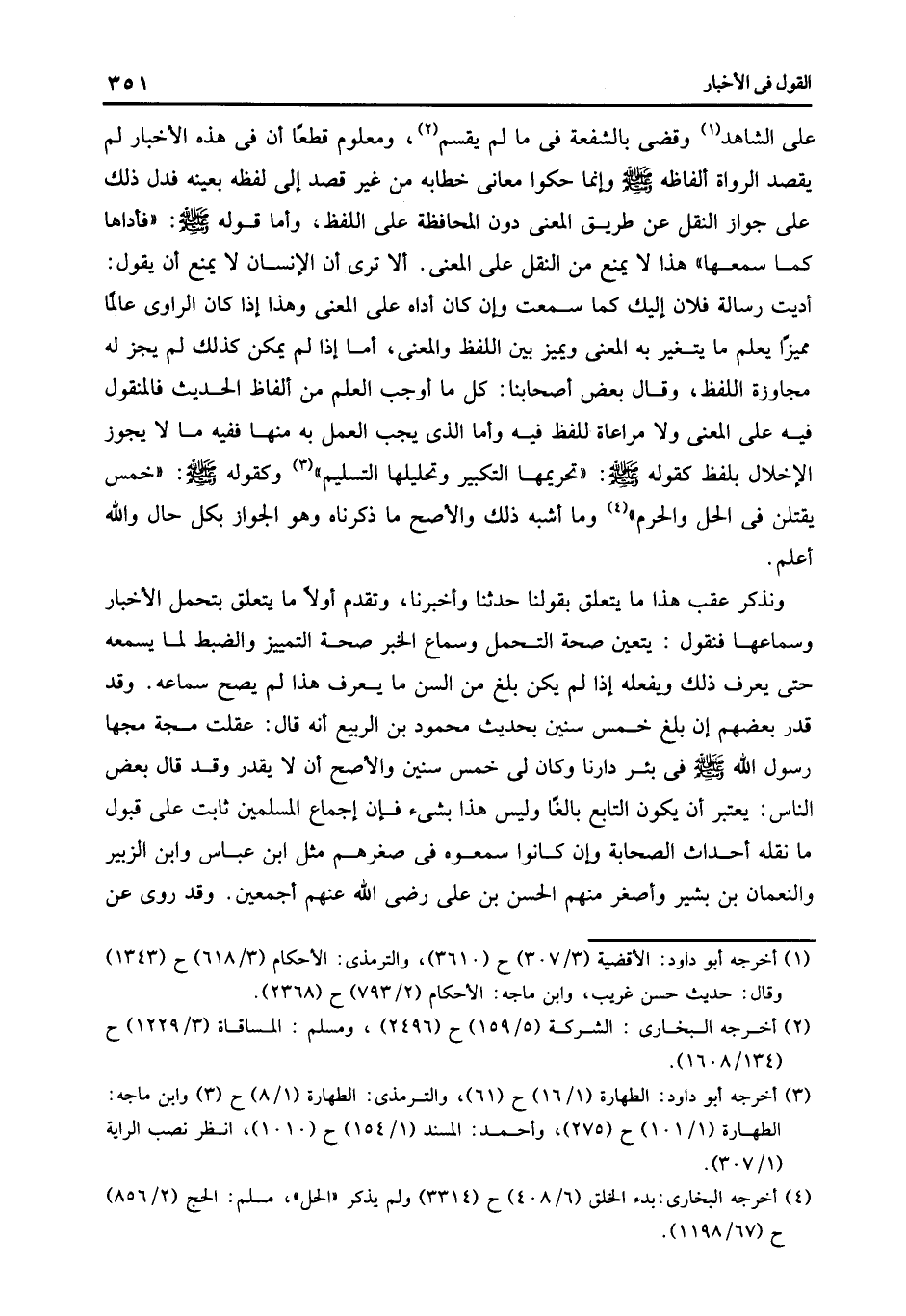 على الشاهد1 وقضى بالشفعة فى ما لم يقسم2 ومعلوم قطعا أن فى هذه الأخبار لم يقصد الرواة ألفاظه صلى الله عليه وسلم وإنما حكوا معانى خطابه من غير قصد إلى لفظه بعينه فدل ذلك على جواز النقل عن طريق المعنى دون المحافظة على اللفظ وأما قوله صلى الله عليه وسلم فأداها كما سمعها هذا لا يمنع من النقل على المعنى ألا ترى أن الإنسان لا يمنع أن يقول: أديت رسالة فلان إليك كما سمعت وأن كان أداه على المعنى وهذا إذا كان الراوى عالما مميزا يعلم ما يتغير به المعنى ويميز بين اللفظ والمعنى أما إذا لم يمكن كذلك لم يجز له مجاوزة اللفظ وقال بعض أصحابنا كل ما أوجب العلم من ألفاظ الحديث فالمنقول فيه على المعنى ولا مراعاة للفظ فيه وأما الذى يجب العمل به منها ففيه ما لا يجوز الإخلال بلفظ كقوله صلى الله عليه وسلم: "تحريمها التكبير وتحليلها التسليم" 3 وكقوله صلى الله عليه وسلم: "خمس يقتلن فى الحل والحرم" 4 وما أشبه ذلك والأصح ما ذكرناه وهو الجواز بكل حال والله أعلم.
