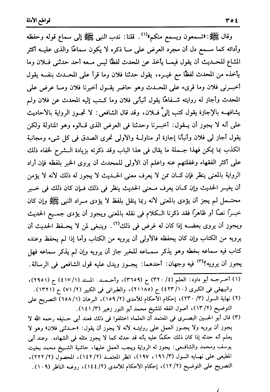 وقال صلى الله عليه وسلم: "تسمعون ويسمع منكم" 1 قلنا ندب النبى صلى الله عليه وسلم إلى سماع قوله وحفظه وأدائه كما سمع دل أن مجرد العرض على ما ذكره لا يكون سماعا والذى عليه أكثر المشاع للحديث أن يقول: فيما يأخذ عن المحدث لفظا ليس معه أحد حدثنى فلان وما يأخذه من المحدث لفظا مع غيره يقول: حدثنا فلان وما قرأ على المحدث بنفسه يقول: أخبرنى فلان وما قرىء على المحدث وهو حاضر يقول: أخبرنا فلان وما عرض على المحدث وأجاز له روايته شفاها يقول: أنبأنى فلان وما كتب إليه المحدث عن فلان ولم يشافهه بالإجازة يقول: كتب إلى فلان وقد قال الشافعى لا تجوز الرواية بالأحاديث على أنه لا يجوز أن يقول: أخبرنا وحدثنا فى العرض الذى قالوه وهو المناولة ولكن يقول: أجاز لى فلان وأنبأنا أجازة أو مناولة والأولى تحرى الصدق فى كل شىء ومجانبة الكذب بما يمكن فهذا جملة ما يقال فى هذا الباب وقد ذكرته بزيادة الشرح لخفاء ذلك على أكثر الفقهاء وغفلتهم عنه واعلم أن الأولى للمحدث أن يروى الخبر بلفظه فإن أراد الرواية بالمعنى ينظر فإن كان ممن لا يعرف معنى الحديث لا يجوز له ذلك لأنه لا يؤمن أن يغير الحديث وأن كان يعرف معنى الحديث ينظر فى ذلك فإن كان ذلك فى خبر محتمل لم يجز أن يؤدى بالمعنى لأنه ربما ينقل بلفظ لا يؤدى مراد النبى صلى الله عليه وسلم وأن كان خبرا نصا أو ظاهرا فقد ذكرنا الكلام فى نقله بالمعنى ويجوز أن يؤدى جميع الحديث ويجوز أن يروى بعضه إذا كان له غرض فى ذلك2 وينبغى لمن لا يحفظ الحديث أن يرويه من الكتاب وأن كان يحفظه فالأولى أن يرويه من الكتاب وأما إذا لم يحفظ وعنده كتاب فيه سماعه بخطه وهو يذكر سماعه للخبر جاز أن يرويه وأن لم يذكر سماعه فهل يجوز أن يرويه3 فيه وجهان أحدهما يجوز ويدل عليه قول الشافعى فى الرسالة.