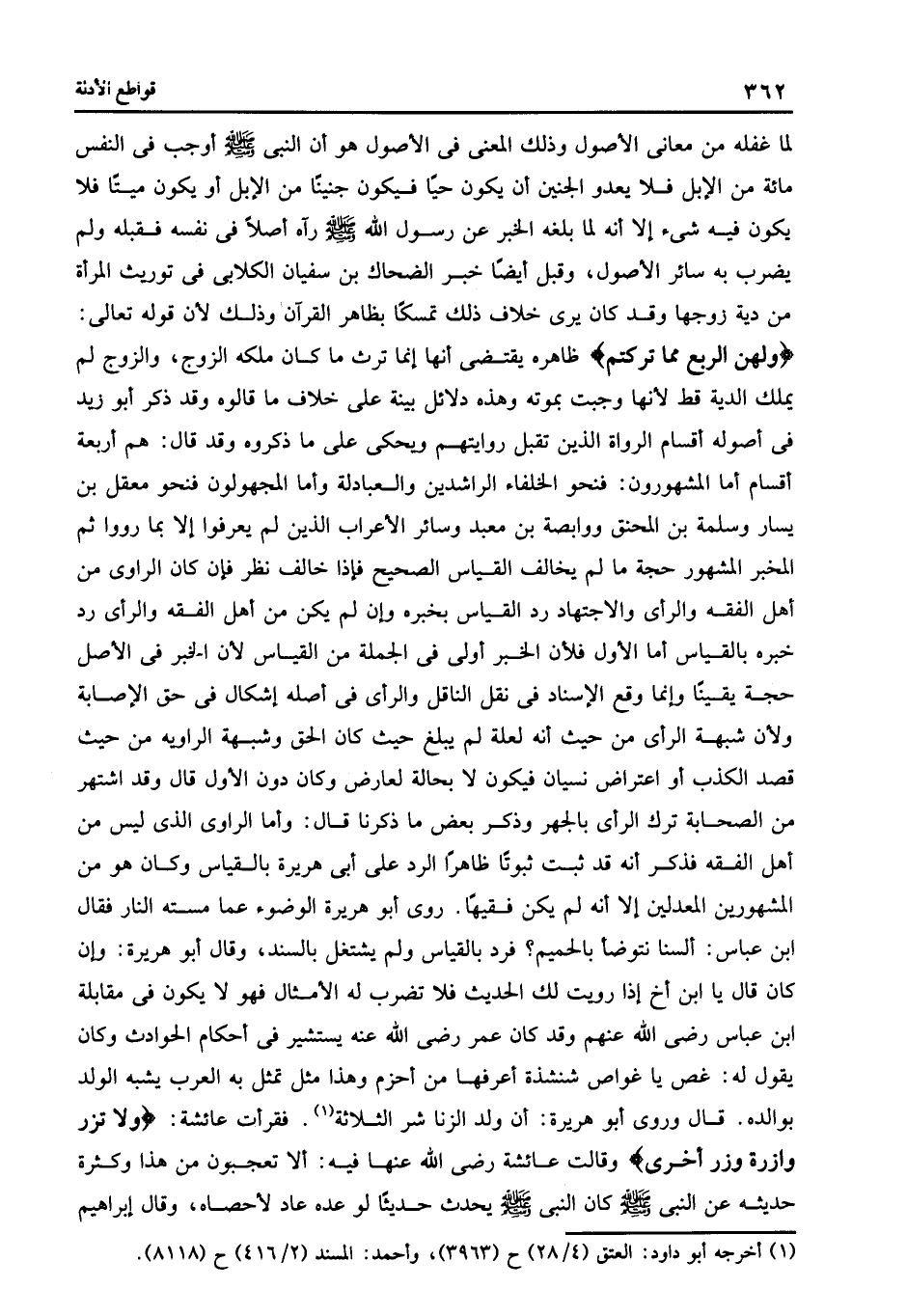 لما غفله من معانى الأصول وذلك المعنى فى الأصول هو أن النبى صلى الله عليه وسلم أوجب فى النفس مائة من الإبل فلا يعدو الجنين أن يكون حيا فيكون جنينا من الإبل أو يكون ميتا فلا يكون فيه شىء إلا أنه لما بلغه الخبر عن رسول الله صلى الله عليه وسلم رآه أصلا فى نفسه فقبله ولم يضرب به سائر الأصول وقبل أيضا خبر الضحاك بن سفيان الكلابى فى توريث المرأة من دية زوجها وقد كان يرى خلاف ذلك تمسكا بظاهر القرآن وذلك لأن قوله تعالى: {وَلَهُنَّ الرُّبُعُ مِمَّا تَرَكْتُمْ} ظاهره يقتضى أنها إنما ترث ما كان ملكه الزوج والزوج لم يملك الدية قط لأنها وجبت بموته وهذه دلائل بينة على خلاف ما قالوه وقد ذكر أبو زيد فى أصوله أقسام الرواة الذين تقبل روايتهم ويحكى على ما ذكروه وقد قال هم أربعة أقسام أما المشهورون فنحو الخلفاء الراشدين والعبادلة وأما المجهولون فنحو معقل بن يسار وسلمة بن المحنق ووابصة بن معبد وسائر الأعراب الذين لم يعرفوا إلا بما رووا ثم المخبر المشهور حجة ما لم يخالف القياس الصحيح فإذا خالف نظر فإن كان الراوى من أهل الفقه والرأى والاجتهاد رد القياس بخبره وأن لم يكن من أهل الفقه والرأى رد خبره بالقياس أما الأول فلأن الخبر أولى فى الجملة من القياس لأن الخبر فى الأصل حجة يقينا وإنما وقع الإسناد فى نقل الناقل والرأى فى أصله إشكال فى حق الإصابة ولأن شبهة الرأى من حيث أنه لعلة لم يبلغ حيث كان الحق وشبهة الراويه من حيث قصد الكذب أو اعتراض نسيان فيكون لا بحالة لعارض وكان دون الأول قال وقد اشتهر من الصحابة ترك الرأى بالجهر وذكر بعض ما ذكرنا قال وأما الراوى الذى ليس من أهل الفقه فذكر أنه قد ثبت ثبوتا ظاهرا الرد على أبى هريرة بالقياس وكان هو من المشهورين المعدلين إلا أنه لم يكن فقيها روى أبو هريرة الوضوء عما مسته النار فقال ابن عباس ألسنا نتوضأ بالحميم فرد بالقياس ولم يشتغل بالسند وقال أبو هريرة وأن كان قال يا ابن أخ إذا رويت لك الحديث فلا تضرب له الأمثال فهو لا يكون فى مقابلة ابن عباس رضى الله عنهم وقد كان عمر رضى الله عنه يستشير فى أحكام الحوادث وكان يقول له: غص يا غواص شنشذة أعرفها من أحزم وهذا مثل تمثل به العرب يشبه الولد بوالده قال وروى أبو هريرة أن ولد الزنا شر الثلاثة1 فقرأت عائشة: {وَلا تَزِرُ وَازِرَةٌ وِزْرَ أُخْرَى} وقالت عائشة رضى الله عنها فيه إلا تعجبون من هذا وكثرة حديثه عن النبى صلى الله عليه وسلم كان النبى صلى الله عليه وسلم يحدث حديثا لو عده عاد لأحصاه وقال إبراهيم.