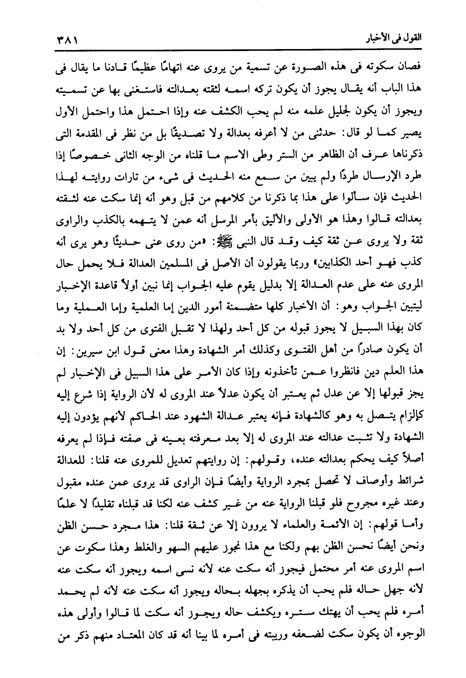 فصان سكوته فى هذه الصورة عن تسمية من يروى عنه اتهاما عظيما قادنا ما يقال فى هذا الباب أنه يقال يجوز أن يكون تركه اسمه لثقته بعدالته فاستغنى بها عن تسميته ويجوز أن يكون لجليل علمه منه لم يحب الكشف عنه وإذا احتمل هذا واحتمل الأول يصير كما لو قال حدثنى من لا أعرفه بعدالة ولا تصديقا بل من نظر فى المقدمة التى ذكرناها عرف أن الظاهر من الستر وطى الاسم ما قلناه من الوجه الثانى خصوصا إذا طرد الإرسال طردا ولم يبين من سمع منه الحديث فى شىء من تارات روايته لهذا الحديث فإن سألوا على هذا بما ذكرنا من كلامهم من قبل وهو أنه إنما سكت عنه لثقته بعدالته قالوا: وهذا هو الأولى والأليق بأمر المرسل أنه عمن لا يتهمه بالكذب والراوى ثقة ولا يروى عن ثقة كيف وقد قال النبى صلى الله عليه وسلم: "من روى عنى حديثا وهو يرى أنه كذب فهو أحد الكذابين" وربما يقولون أن الأصل فى المسلمين العدالة فلا يحمل حال المروى عنه على عدم العدالة إلا بدليل يقوم عليه الجواب إنما نبين أولا قاعدة الإخبار ليتبين الجواب وهو أن الأخبار كلها متضمنة أمور الدين أما العلمية وأما العملية وما كان بهذا السبيل لا يجوز قبوله من كل أحد ولهذا لا تقبل الفتوى من كل أحد ولا بد أن يكون صادرا من أهل الفتوى وكذلك أمر الشهادة وهذا معنى قول ابن سيرين أن هذا العلم دين فانظروا عمن تأخذونه وإذا كان الأمر على هذا السبيل فى الإخبار لم يجز قبولها إلا عن عدل ثم يعتبر أن يكون عدلا عند المروى له لأن الرواية إذا شرع إليه كإلزام يتصل به وهو كالشهادة فإنه يعتبر عدالة الشهود عند الحاكم لأنهم يؤدون إليه الشهادة ولا تثبت عدالته عند المروى له إلا بعد معرفته بعينه فى صفته فإذا لم يعرفه أصلا كيف يحكم بعدالته عنده وقولهم أن روايتهم تعديل للمروى عنه قلنا للعدالة شرائط وأوصاف لا تحصل بمجرد الرواية وأيضا فإن الراوى قد يروى عمن عنده مقبول وعند غيره مجروح فلو قبلنا الرواية عنه من غير كشف عنه لكنا قد قبلناه تقليدا لا علما وأما قولهم أن الأئمة والعلماء لا يروون إلا عن ثقة قلنا هذا مجرد حسن الظن ونحن أيضا نحسن الظن بهم ولكنا مع هذا نجوز عليهم السهو والغلط وهذا سكوت عن اسم المروى عنه أمر محتمل فيجوز أنه سكت عنه لأنه نسى اسمه ويجوز أنه سكت عنه لأنه جهل حاله فلم يحب أن يذكره بجهله بحاله ويجوز أنه سكت عنه لأنه لم يحمد أمره فلم يحب أن يهتك ستره ويكشف حاله ويجوز أنه سكت لما قالوا: وأولى هذه الوجوه أن يكون سكت لضعفه وريبته فى أمره لما بينا أنه قد كان المعتاد منهم ذكر من.