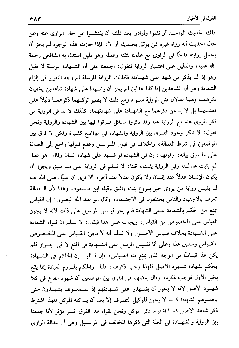 ذلك الحديث الواحد أو نقلوا وأرادوا بعد ذلك أن يفتشوا عن حال الراوى عنه وعن حال الحديث أنه رواه غيره ممن يوثق بحديثه أو لا فإذا جازت هذه الوجوه لم يجز أن يجعل روايته قدحا فى الراوى مع علمنا بثقته وعدله وهو دليل استدل به الشافعى رحمة الله عليه والدليل على اعتبار الرواية فنقول أجمعنا على أن الشهادة المرسلة لا تقبل وهو إذا لم يذكر من شهد على شهادته فكذلك الرواية المرسلة ثم وجه التقرير فى إلزام الشهادة وهو أن الشاهدين إذا كانا عدلين لم يجز أن يشهدا على شهادة شاهدين يخفيان ذكرهما وهما عدلان مثل الرواية سواء ومع ذلك لا يصير تركهما ذكرهما دليلا على تعديلهما بل لا بد من ذكرهما مع الشهادة على شهادتهما كذلك لا بد فى الرواية من ذكر المروى عنه مع الرواية عنه وقد ذكروا مسائل فرقوا فيها بين الشهادة والرواية ونحن نقول لا ننكر وجود الفرق بين الرواية والشهادة فى مواضع كثيرة ولكن لا فرق بين الموضعين فى شرط العدالة والخلاف فى قبول المراسيل وعدم قبولها راجع إلى العدالة على ما سبق بيانه وقولهم أن فى الشهادة لو شهد على شهادة إنسان وقال هو عدل لم يثبت عدالته وفى الرواية يثبت قلنا لا نسلم فى الرواية على ما سبق ويجوز أن يكون الإنسان عدلا عند إنسان ولا يكون عدلا عند آخر إلا ترى أن عليا رضى الله عنه لم يقبل رواية من يروى خبر بروع بنت واشق وقبله ابن مسعود وهذا لأن العدالة تعرف بالاجتهاد والناس يختلفون فى الاجتهاد وقال أبو عبد الله البصرى أن القياس يمنع من الحكم بالشهادة على الشهادة فلم يجز قياس المراسيل على ذلك لأنه لا يجوز القياس على المخصوص من القياس ويجاب عن هذا فيقال لا نسلم أن قبول الشهادة على الشهادة بخلاف قياس الأصول ولا نسلم أنه لا يجوز القياس على المخصوص بالقياس وسنبين هذا وعلى أنا نقيس المرسل على الشهادة فى المنع لا فى الجواز فلم يكن هذا قياسا من الوجه الذى يمنع منه القياس فإن قالوا: أن الحاكم فى الشهادة يحكم بشهادة شهود الأصل فلهذا وجب ذكرهم قلنا والحكم بلزوم العبادة إنما يقع بخبر الأول فوجب ذكره وقال بعضهم فى الفرق بين الموضعين أن شهود الفرع فى كلا شهود الأصل لأنه لا يجوز أن يشهدوا على شهادتهم إذا سمعوهم يشهدون حتى يحملوهم الشهادة كما لا يجوز للوكيل التصرف إلا بعد أن يوكله الموكل فلهذا اشترط ذكر شاهد الأصل كما اشترط ذكر الموكل ونحن نقول هذا الفرق غير مؤثر لأنا جمعنا بين الرواية والشهادة فى العلة التى ذكرها المخالف فى المراسيل وهى أن عدالة الراوى.