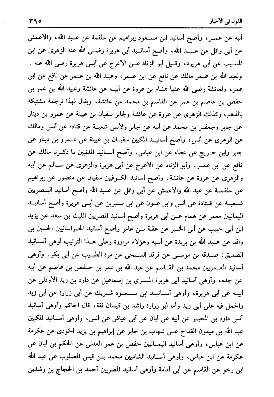 أبيه عن عمر وأصح أسانيد ابن مسعود إبراهيم عن علقمة عن عبد الله والأعمش عن أبى وائل عن عبد الله وأصح أسانيد أبى هريرة رضى الله عنه الزهرى عن ابن المسيب عن أبى هريرة وقيل أبو الزناد عن الأعرج عن أبى هريرة رضى الله عنه ولعبد الله بن عمر مالك عن نافع عن ابن عمر وعبيد الله بن عمر عن نافع عن ابن عمر ولعائشة رضى الله عنها هشام بن عروة عن أبيه عن عائشة وعبيد الله بن عمر بن حفص بن عاصم بن عمر عن القاسم بن محمد عن عائشة ويقال لهذا ترجمة مشتبكة بالذهب وكذلك الزهرى عن عروة عن عائشة ولجابر سفيان بن عيينة عن عمرو بن دينار عن جابر وجعفر بن محمد عن أبيه عن جابر ولأنس شعبة عن قتادة عن أنس ومالك عن الزهرى عن أنس وأصح أسانيد المكيين سفيان بن عيينة عن عمرو بن دينار عن جابر وابن جريج عن عطاء عن ابن عباس وأصح أسانيد المدنيين ما ذكرنا مالك عن نافع عن ابن عمر وأبو الزناد عن الأعرج عن أبى هريرة والزهرى عن سالم عن أبيه والزهرى عن عروة عن عائشة وأصح أسانيد الكوفيين سفيان عن منصور عن إبراهيم عن علقمة عن عبد الله والأعمش عن أبى وائل عن عبد الله وأصح أسانيد البصريين شعبة عن قتادة عن أنس وابن عون عن ابن سيرين عن أبى هريرة وأصح أسانيد اليمانيين معمر عن همام عن أبى هريرة وأصح أسانيد المصريين الليث بن سعد عن يزيد ابن أبى حبيب عن أبى الخير عن عقبة بن عأمر وأصح أسانيد الخراسانيين الحسين بن واقد عن عبد الله بن بريدة عن أبيه وهؤلاء مراوزة وعلى هذا الترتيب أوهى أسانيد الصديق صدقه بن موسى عن فرقد السبخى عن مرة الطبيب عن أبى بكر وأوهى أسانيد العمريين محمد بن القاسم عن عبد الله بن عمر بن حفص بن عاصم عن أبيه عن جده وأوهى أسانيد أبى هريرة المسرى بن إسماعيل عن داود بن زيد الأودلى عن أبيه عن أبى هريرة وأوهى أسانيد ابن مسعود شريك عن أبى زرارة عن أبى زيد والحمل فيه على أبى زيد وأما أبو زرارة راشد بن كيسان ثقة قال الحاكم وأوهى أسانيد أنس داود بن المحبر عن أبيه عن أبان عن أبي عياش عن أنس وأوهى أسانيد المكيين عبد الله بن ميمون القداح عن شهاب بن جابر عن إبراهيم بن يزيد الخودى عن عكرمة عن ابن عباس وأوهى أسانيد اليمانيين حفص بن عمر العدنى عن الحكم بن أبان عن عكرمة عن ابن عباس وأوهى أسانيد الشاميين محمد بن قيس المصلوب عن عبد الله ابن رخو عن القاسم عن أبى أمامة وأوهى أسانيد المصريين أحمد بن الحجاج بن رشدين.